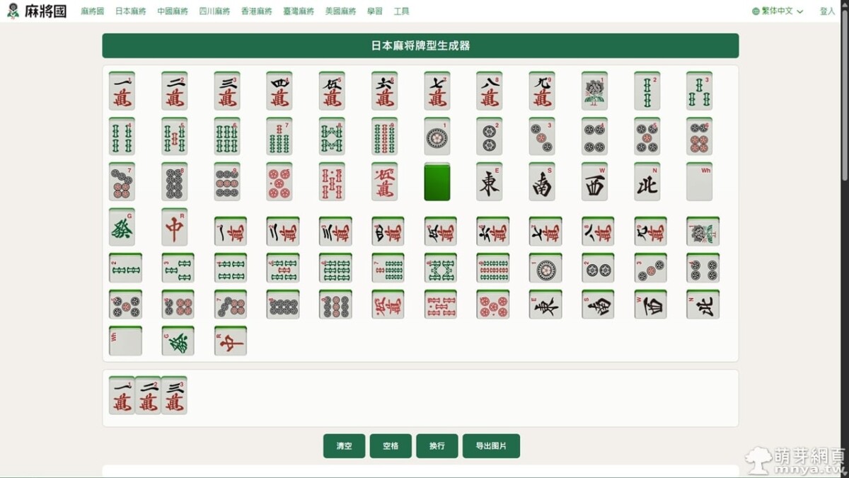 ▲ 以日本麻將牌型生成器來說,可以字型排列,有提供清空、空格、換行這些功能,排完後可以輸出圖片做紀錄或教學分享。
