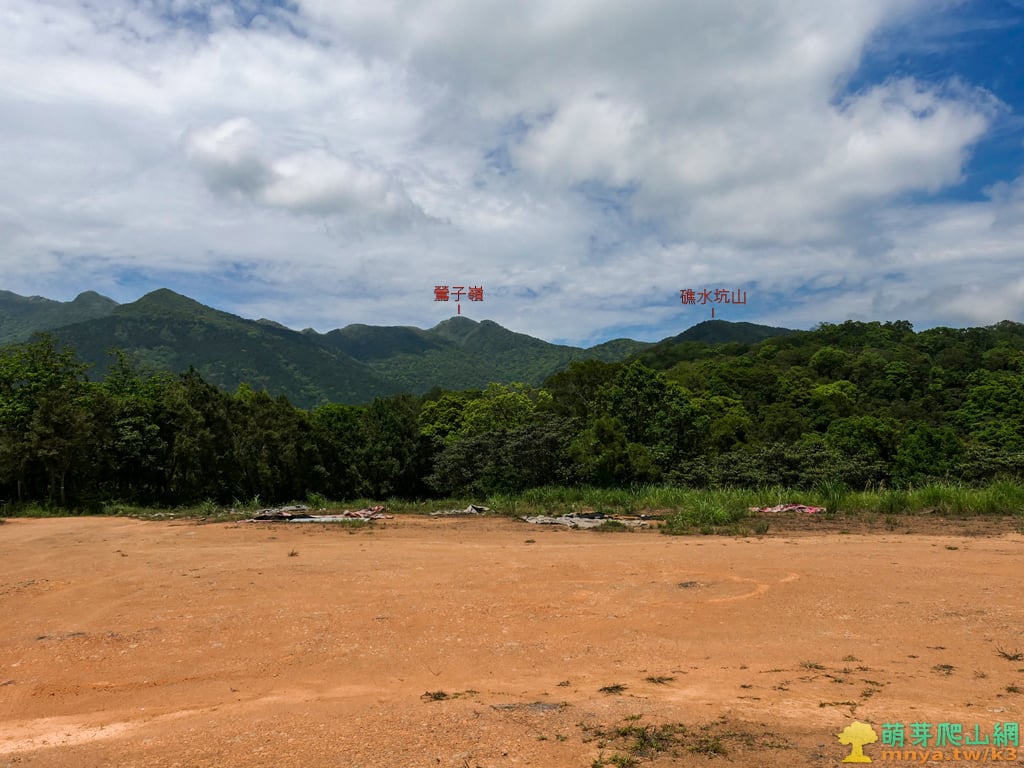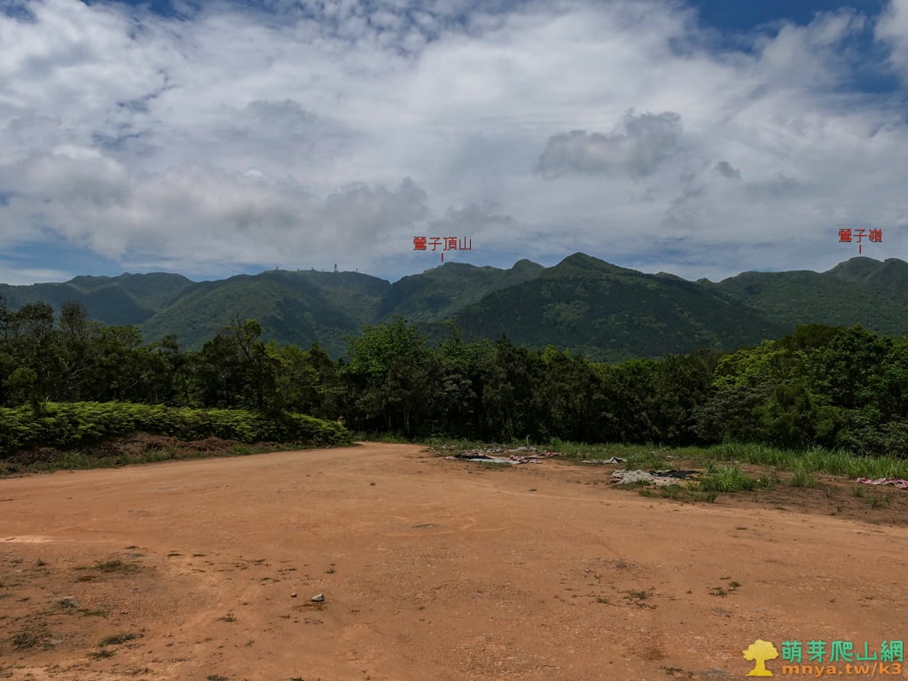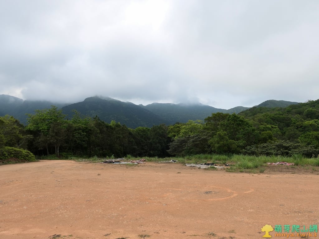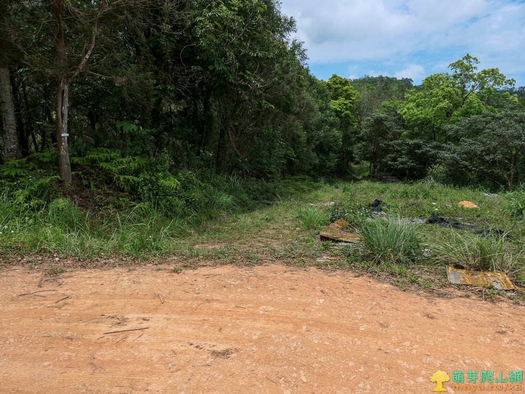 ▲12:38,由稜線大廣場北邊(水泥路上來左側)續行土路,樹上有標牌子往礁水坑山,大平台高約345公尺,岔路口直距礁水坑山南峰約1.03K、礁水坑山南峰北約1.13K。