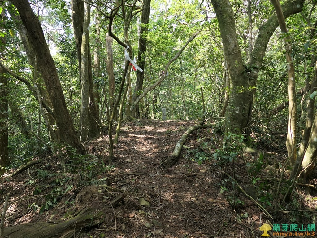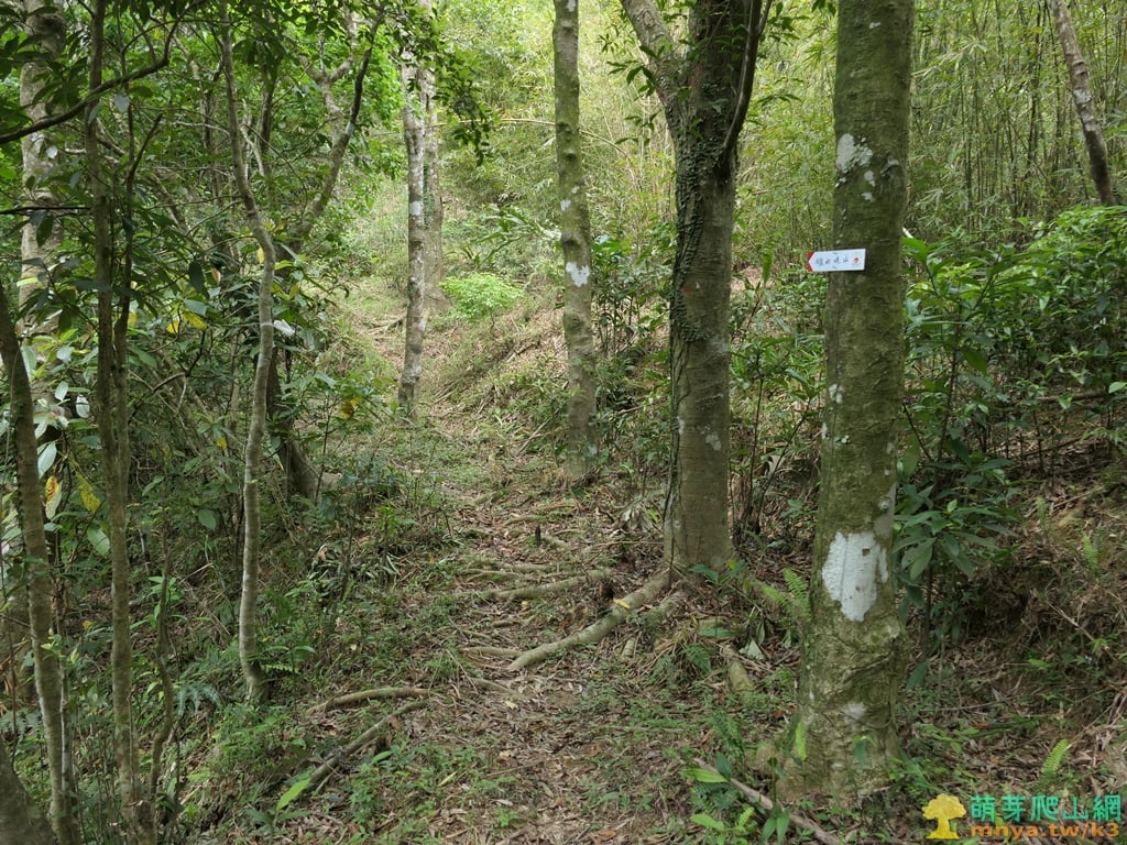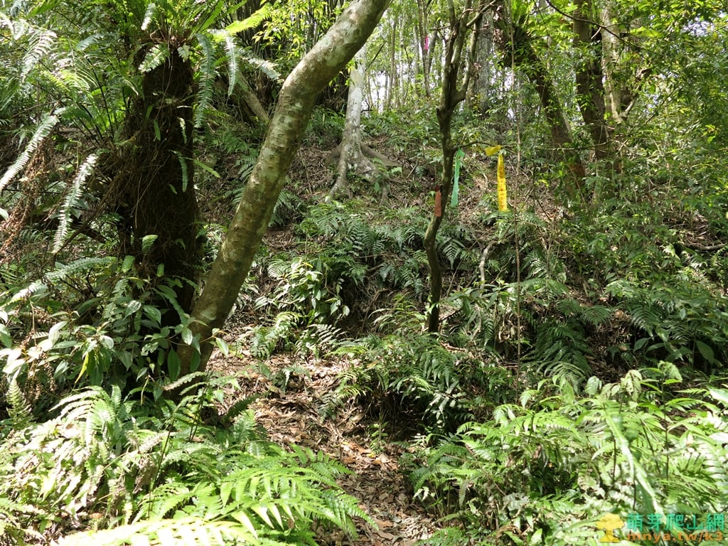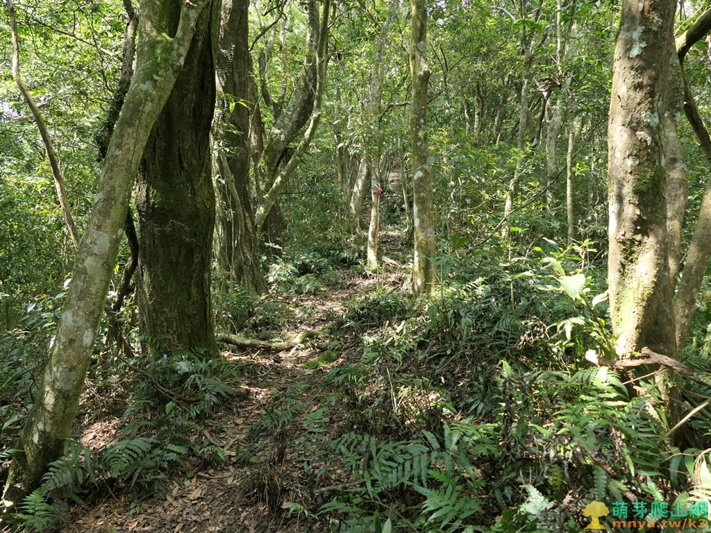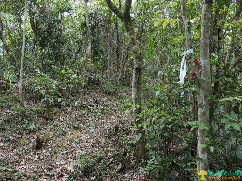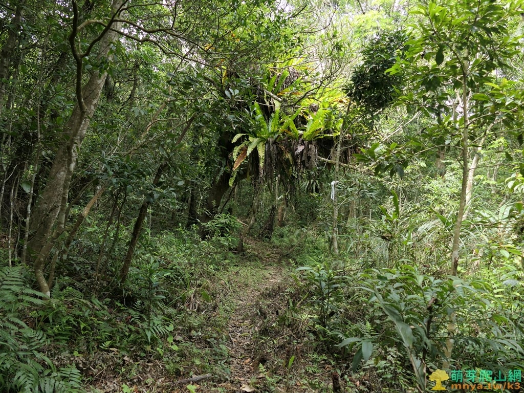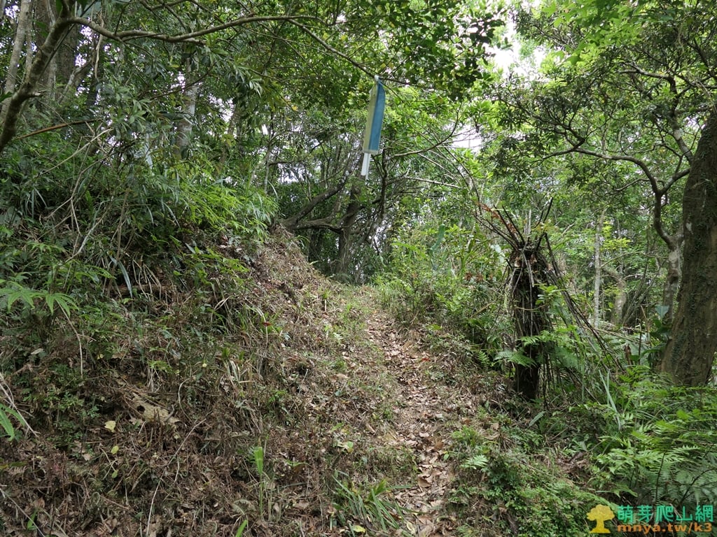 ▲右上後沿稜前行,樹上有釘牌往礁水坑山,近期藍天隊與宜蘭山協剛把山徑打通,走來路況比上次好很多。