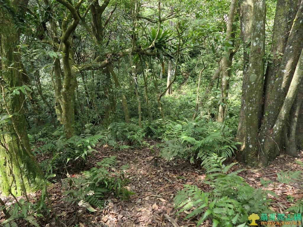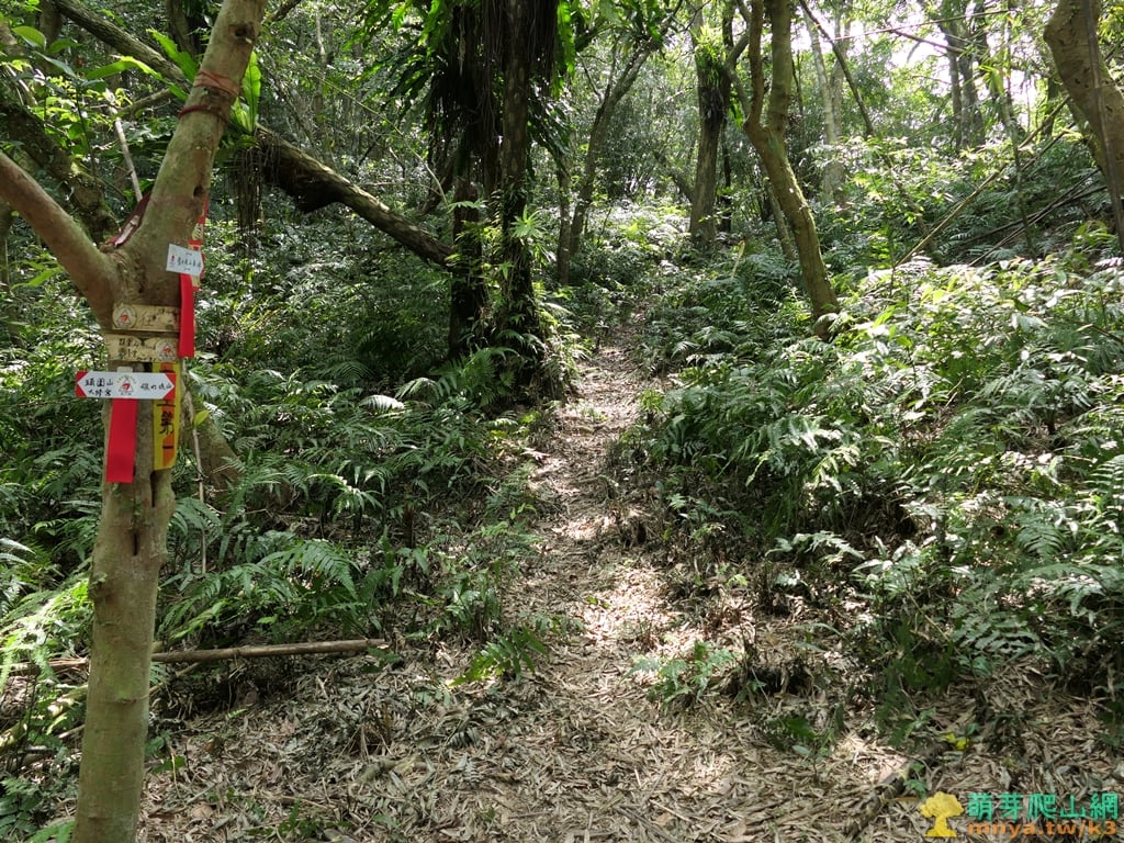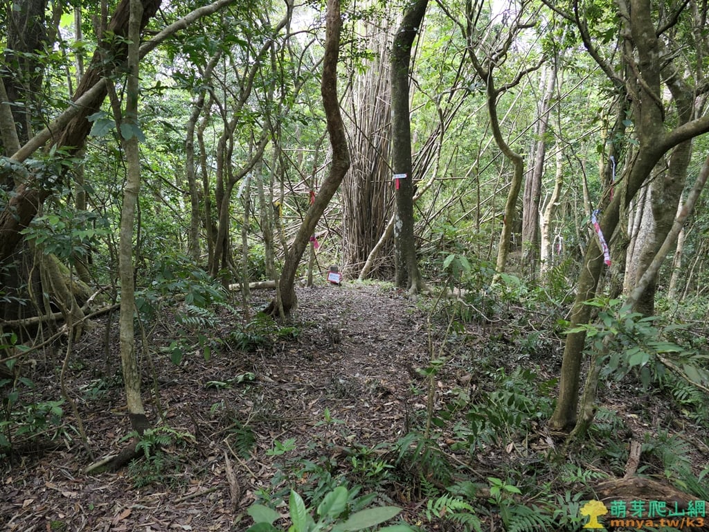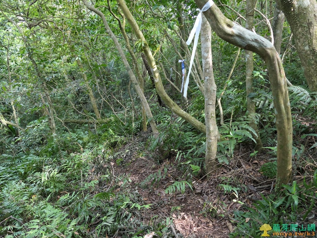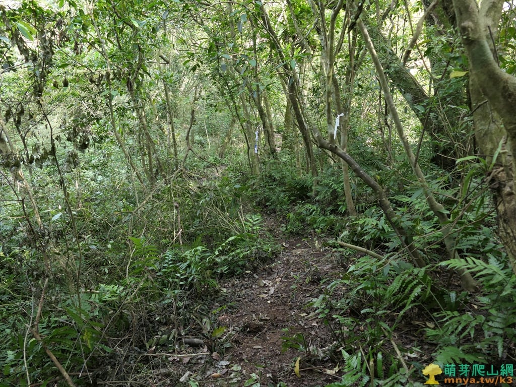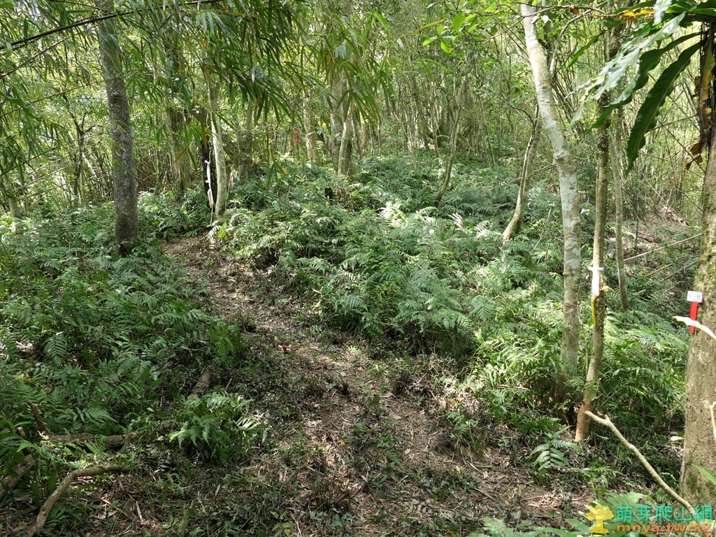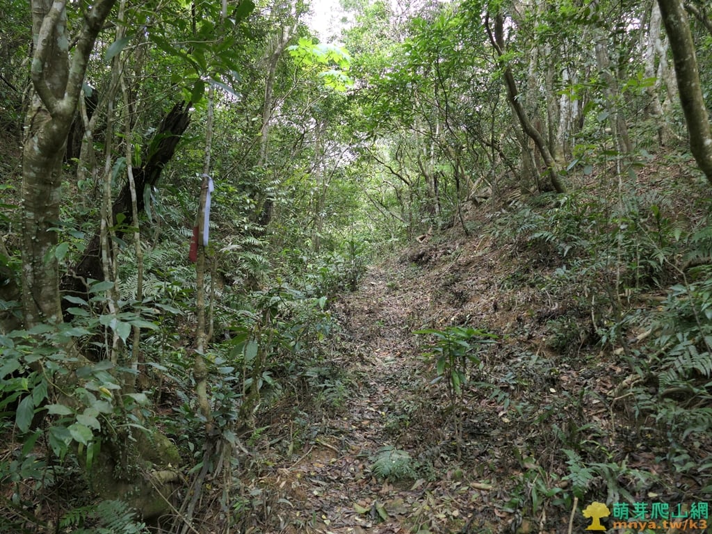 ▲右上後沿稜前行,樹上有釘牌往礁水坑山,近期藍天隊與宜蘭山協剛把山徑打通,走來路況比上次好很多。