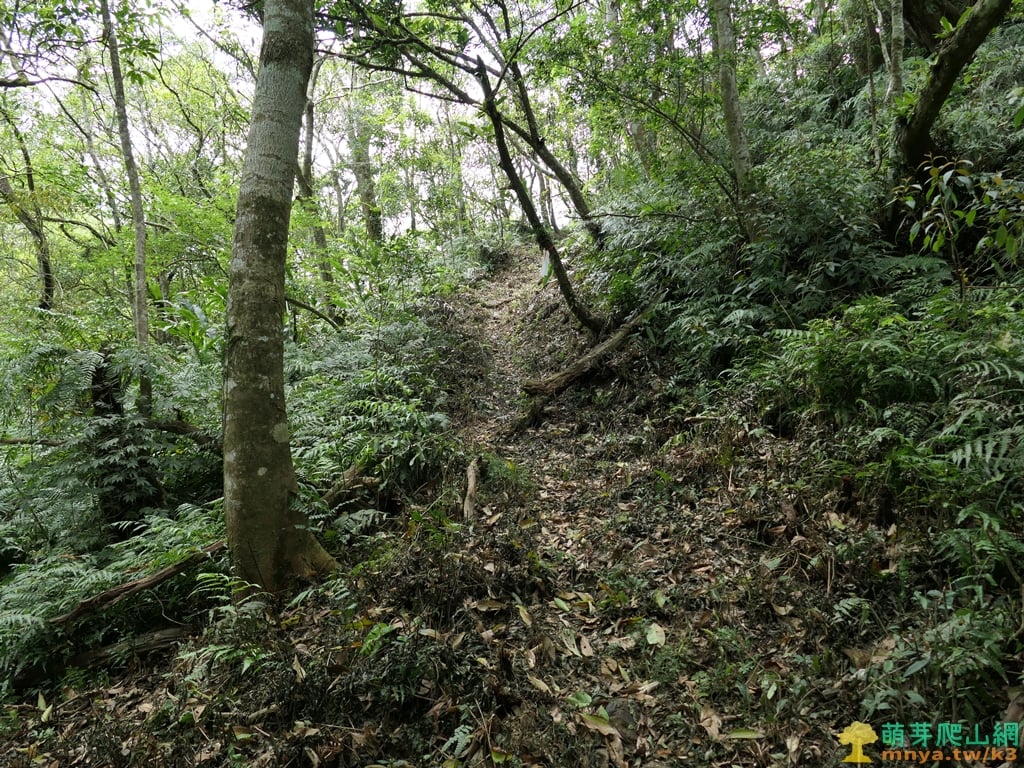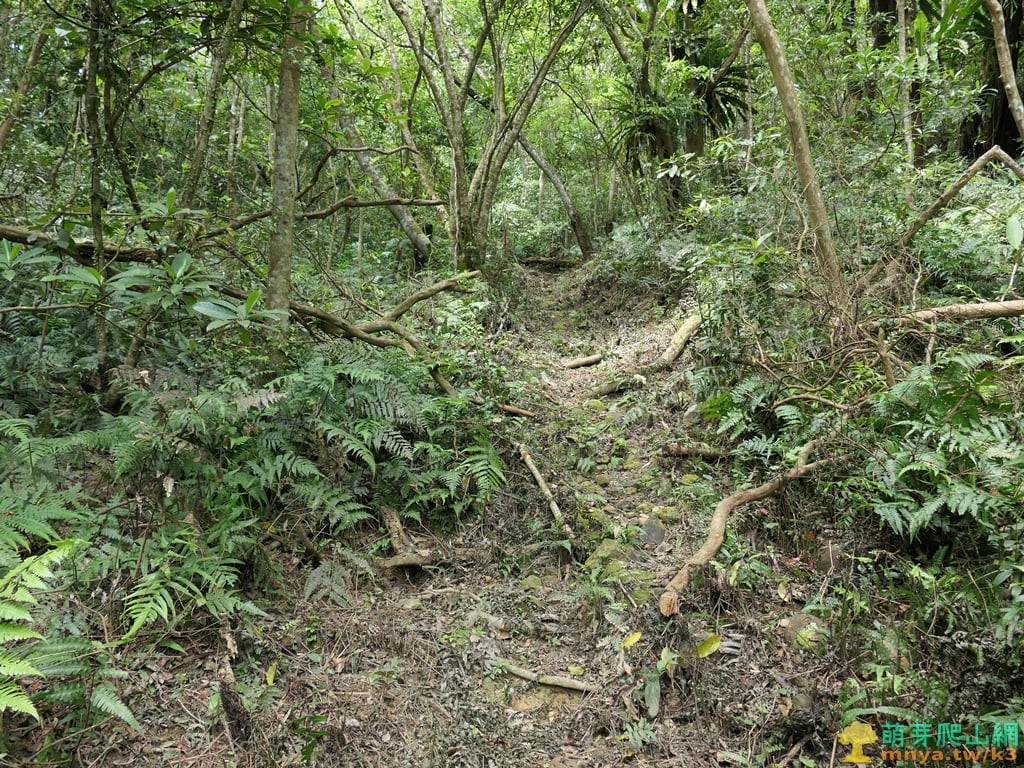 ▲右彎長陡上坡,為通往礁水坑山南峰岔路前少數的陡上坡段。