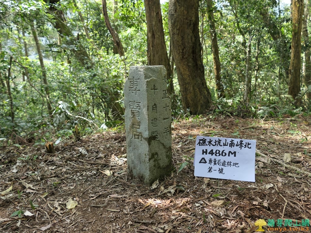▲礁水坑山南峰北 標高486公尺 大正十一年十月建設專賣局造林地第一號 座標:331624, 2754221;24.8915749 121.8161235