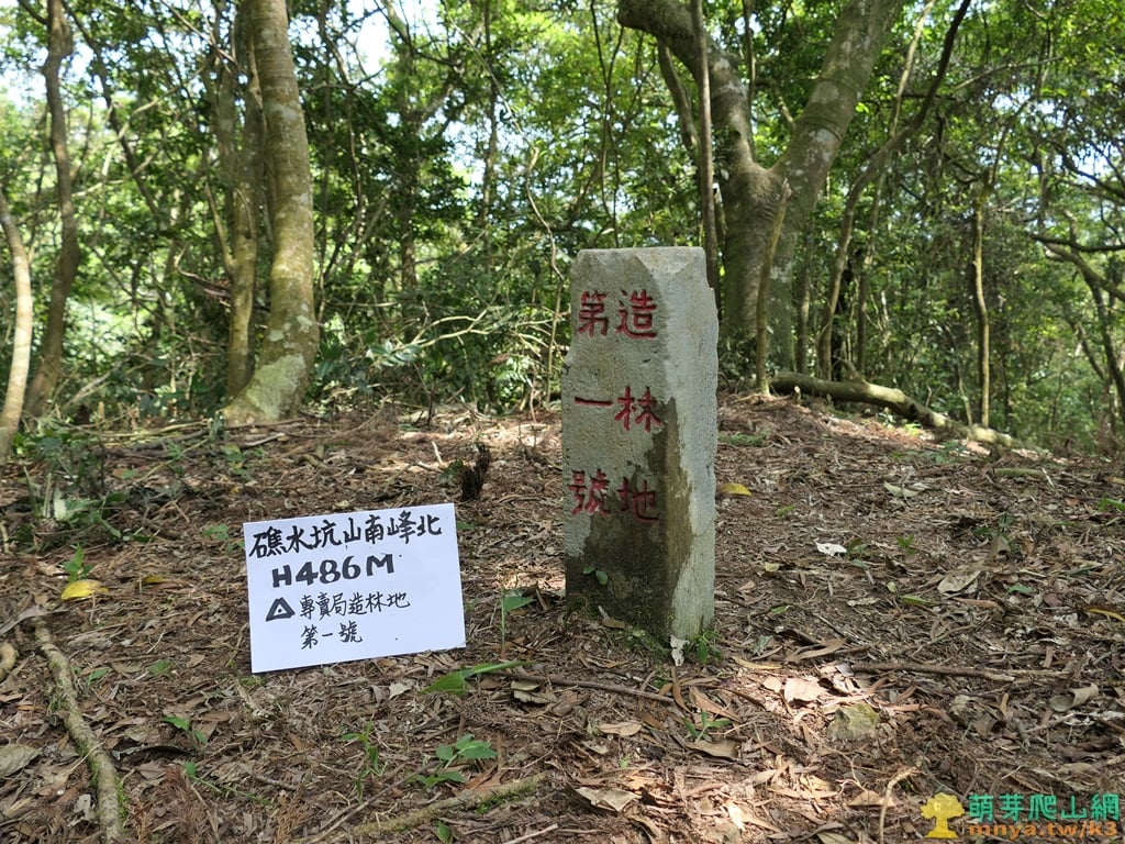 礁水坑山南峰北 標高486公尺 大正十一年十月建設專賣局造林地第一號 座標:331624, 2754221;24.8915749 121.8161235