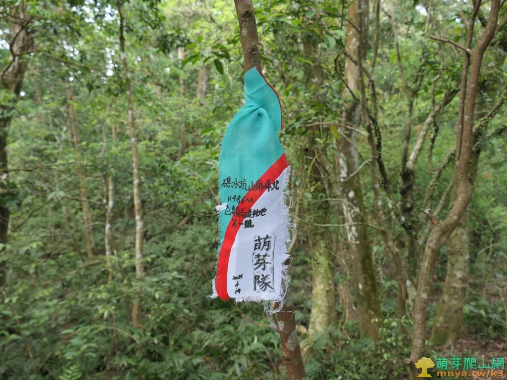 ▲上平緩稜線後續行,樹上有老舊指標往礁水坑山約45~50分。