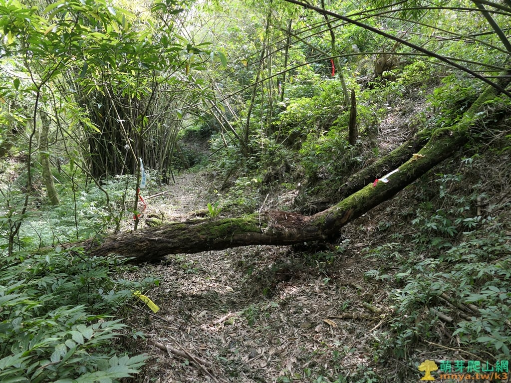 ▲新闢通往礁水坑山南峰的岔路,上切點剛好有一棵倒木,倒木上有指標。