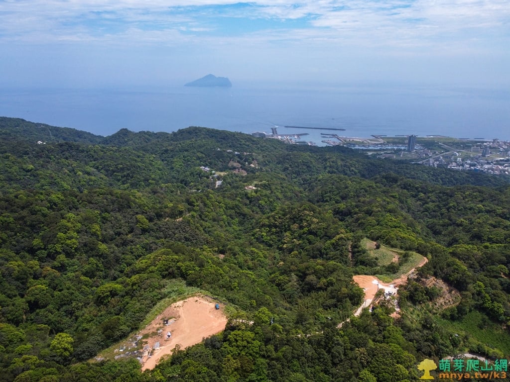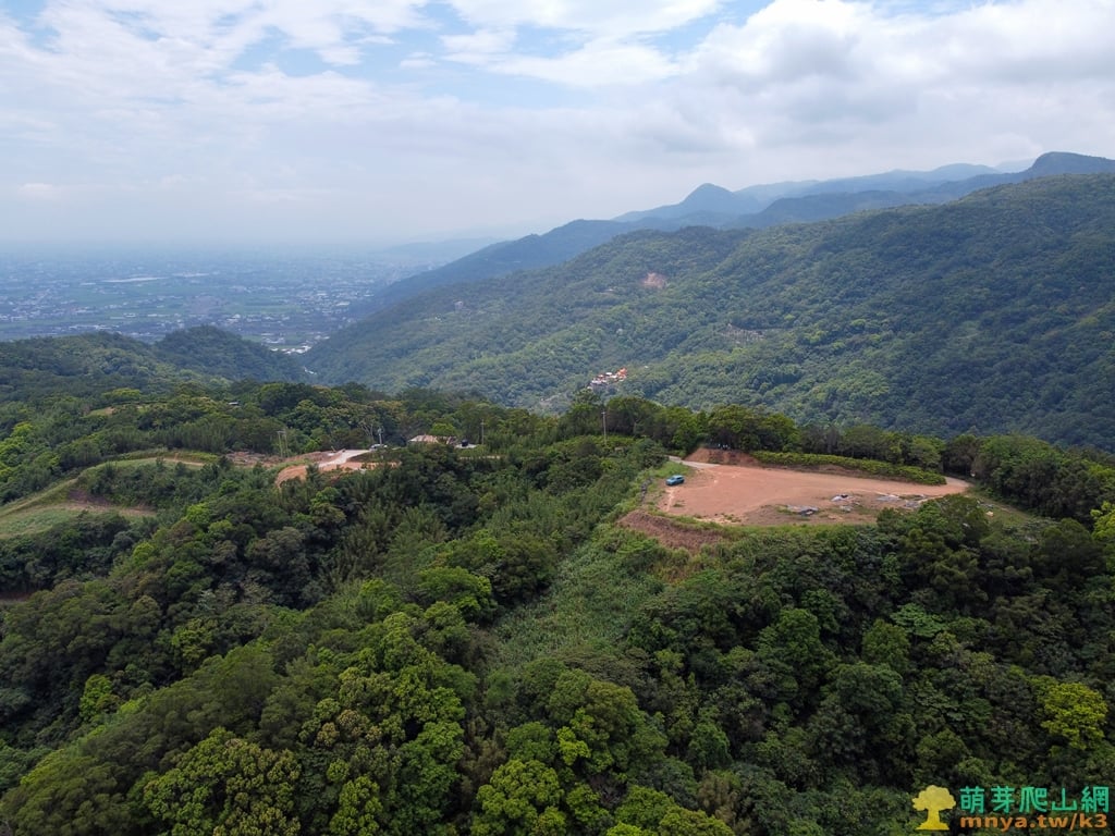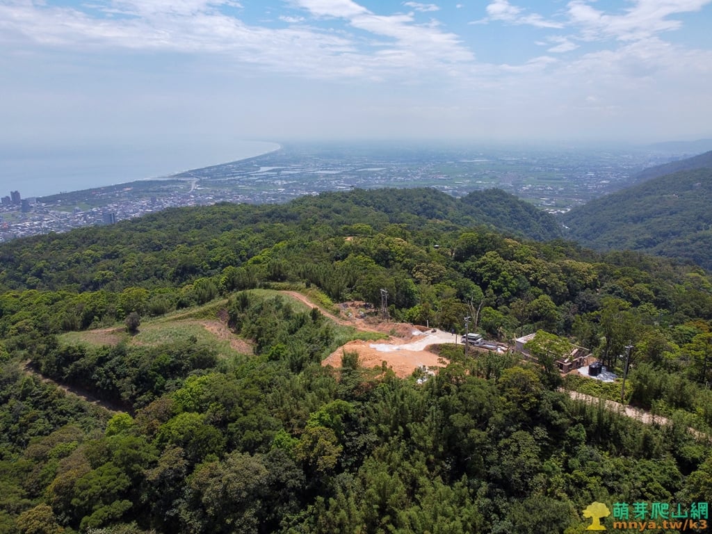 ▲礁水坑山稜線大廣場空拍俯瞰,眺望南邊的蘭陽平原與鵲子山(礁溪富士山;679M)。