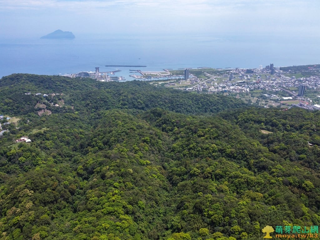 ▲大平台處空拍往東南邊俯瞰頭城鎮,以及烏石港、龜山島。