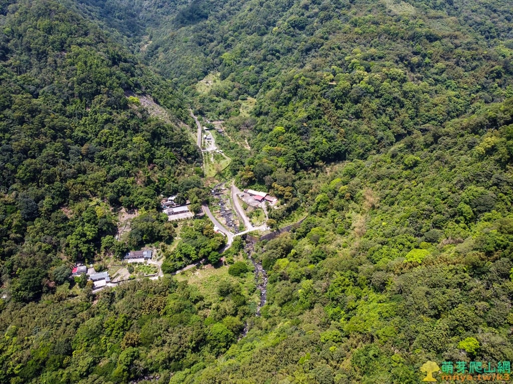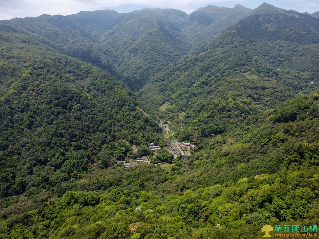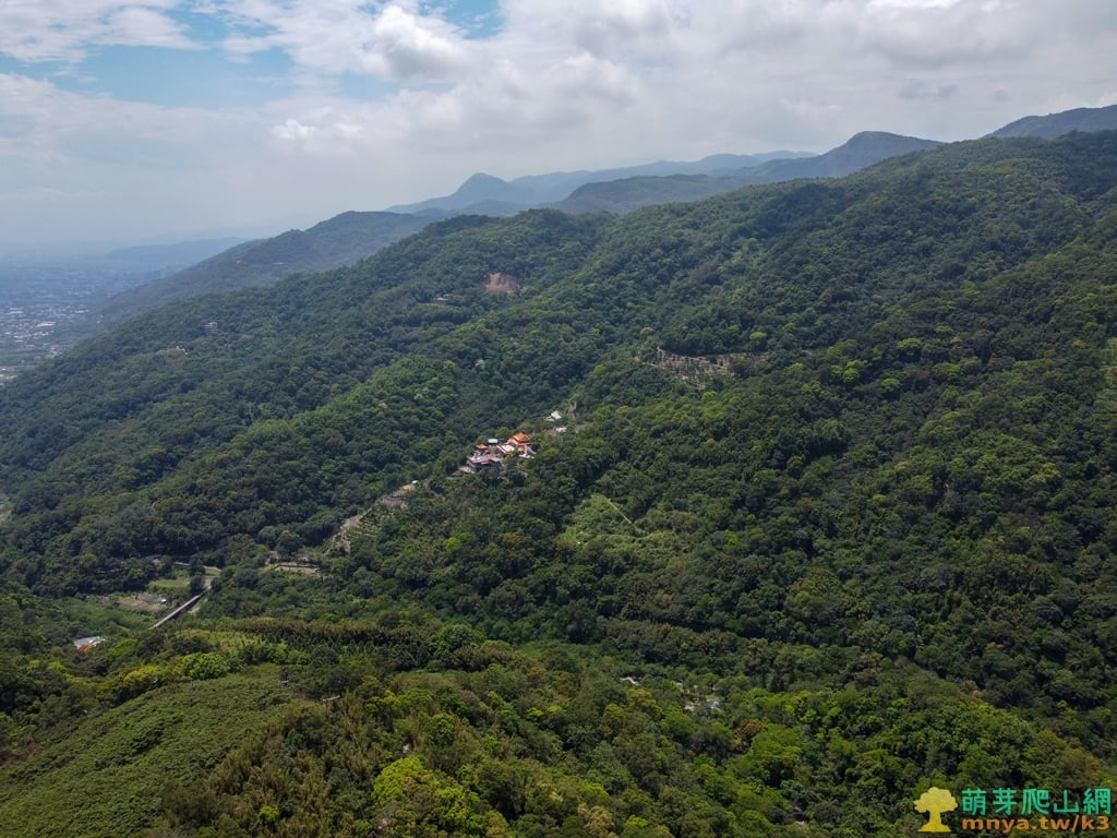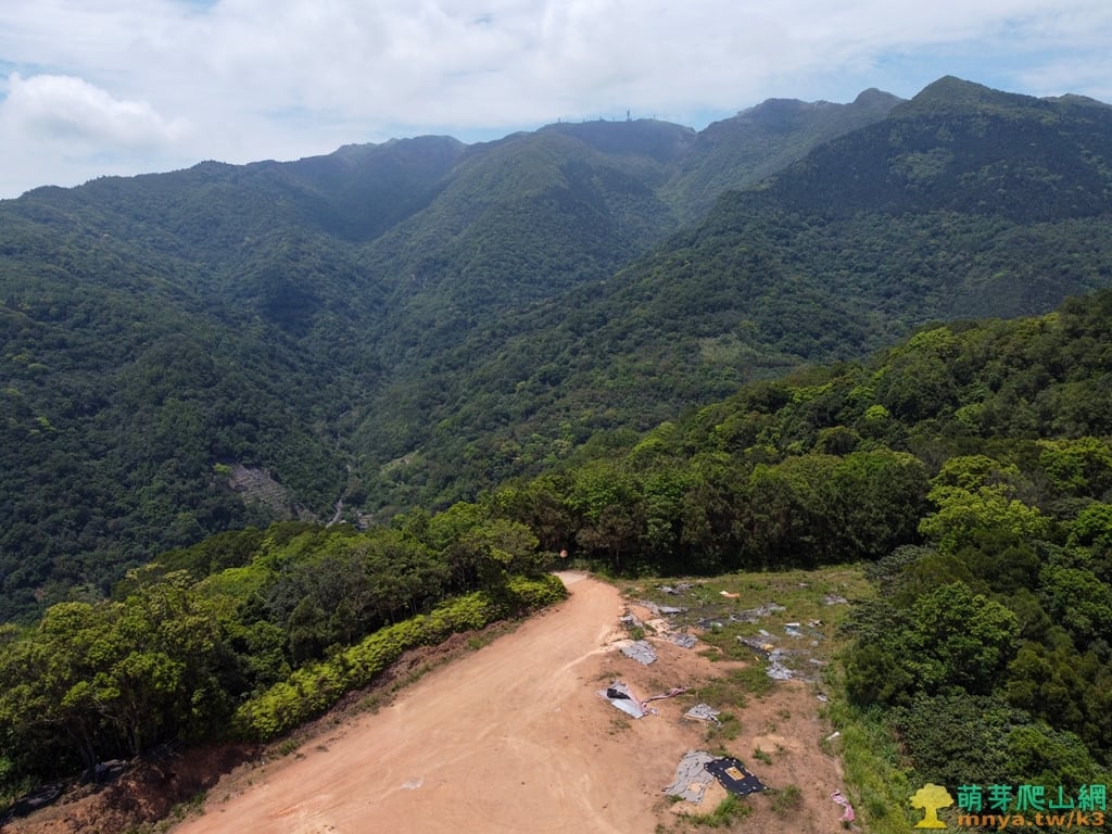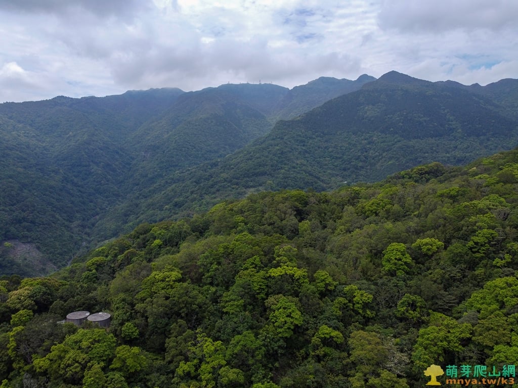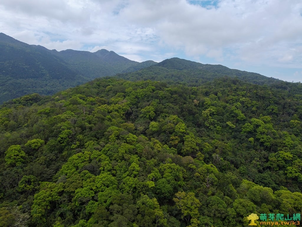 ▲空拍往北眺望礁水坑山(629M)與鶯子嶺(942M)連稜。