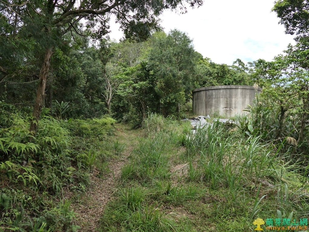 ▲走約百公尺經右側水泥大水塔,續行沿稜左的產業道路往山腰行。