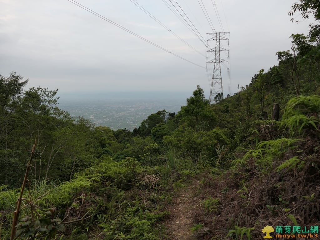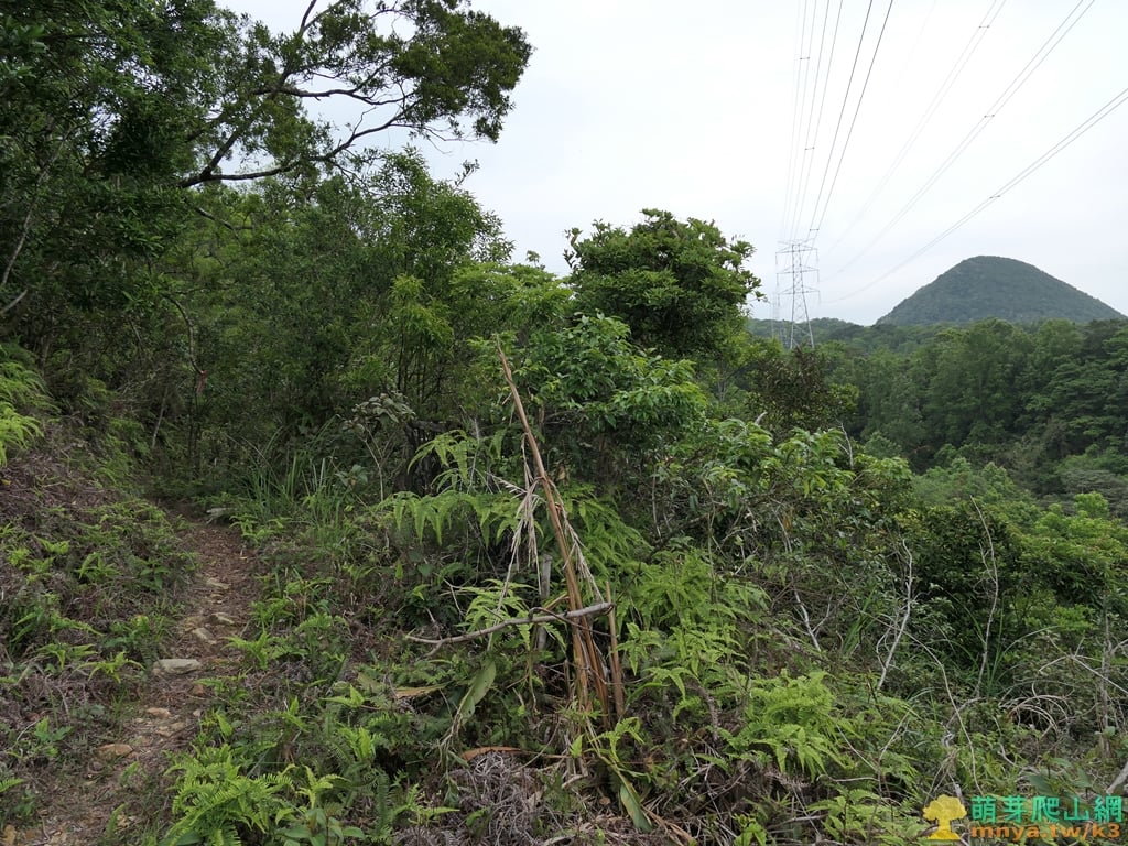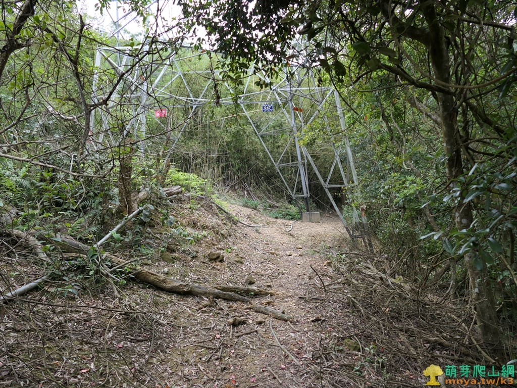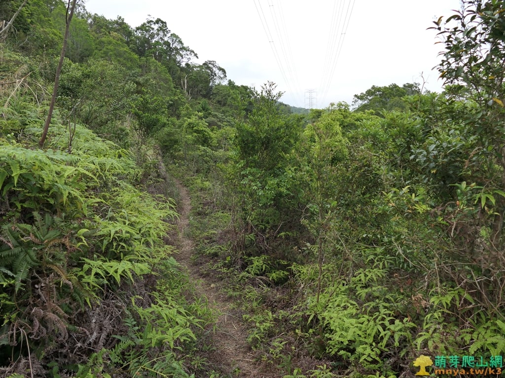 ▲16:52,欣賞完風景後穿越第二處電塔(坪林-員山線046)取直,接著續行保線路沿山腰邊,路徑轉為平緩。