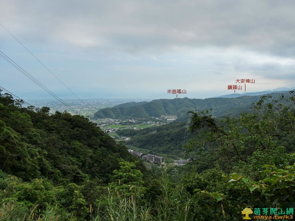 ▲往西南邊俯瞰平原西側山稜,俯瞰山下的得子口溪與對面的米曲瑤山(225M),遠方山稜標示可見下圖。
