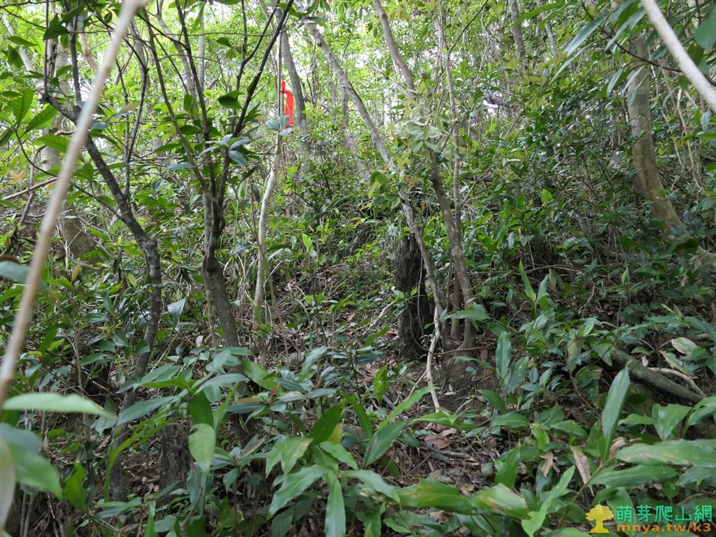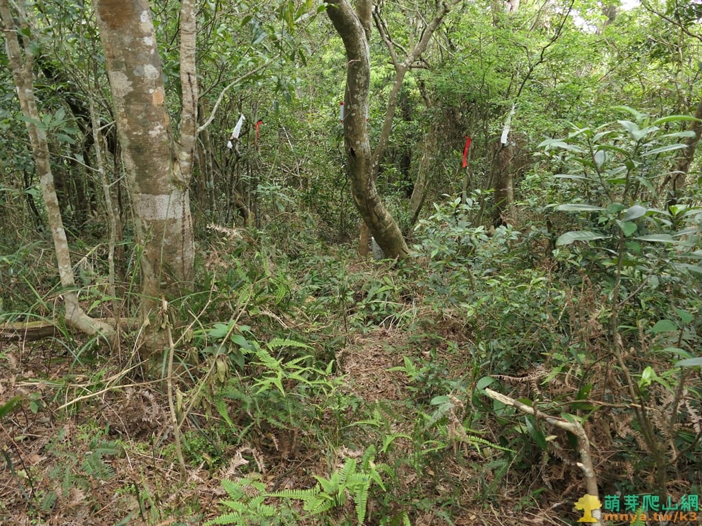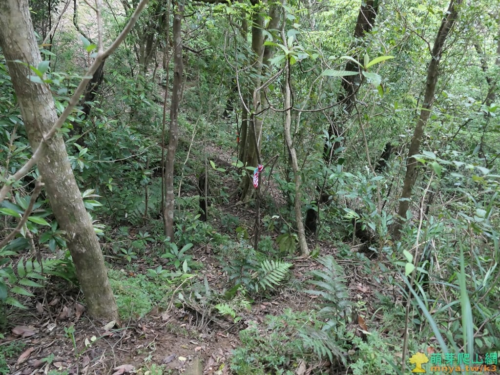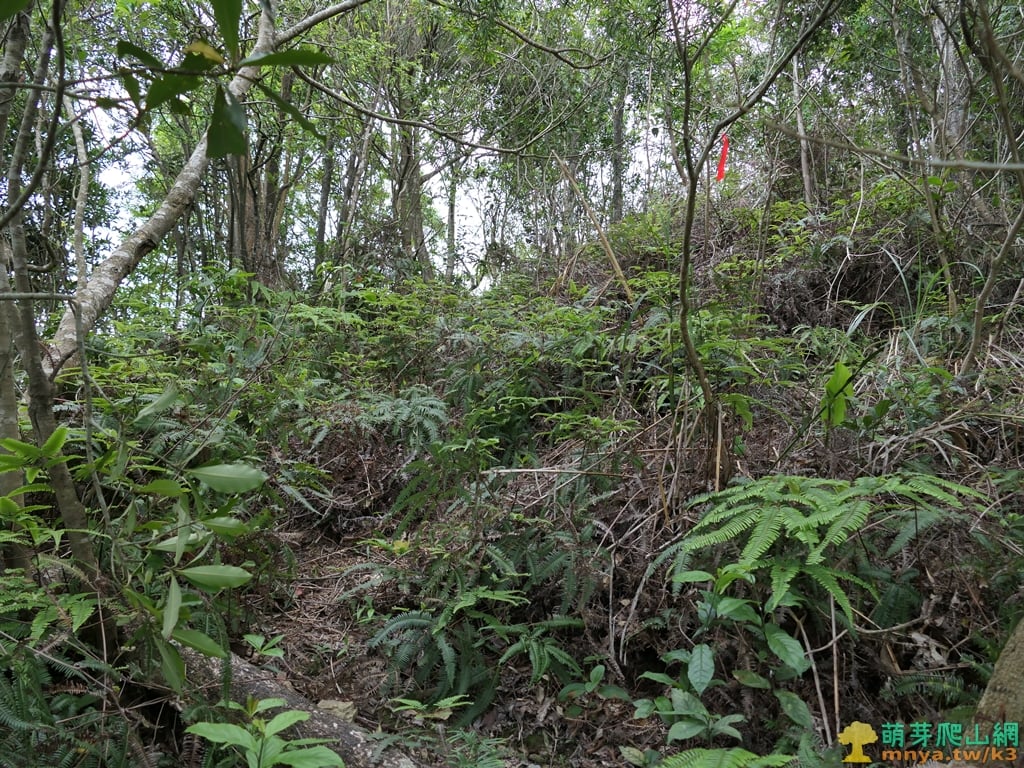 ▲直上雜木叢山坡接往稜線方向,沿途有山友路條可循。