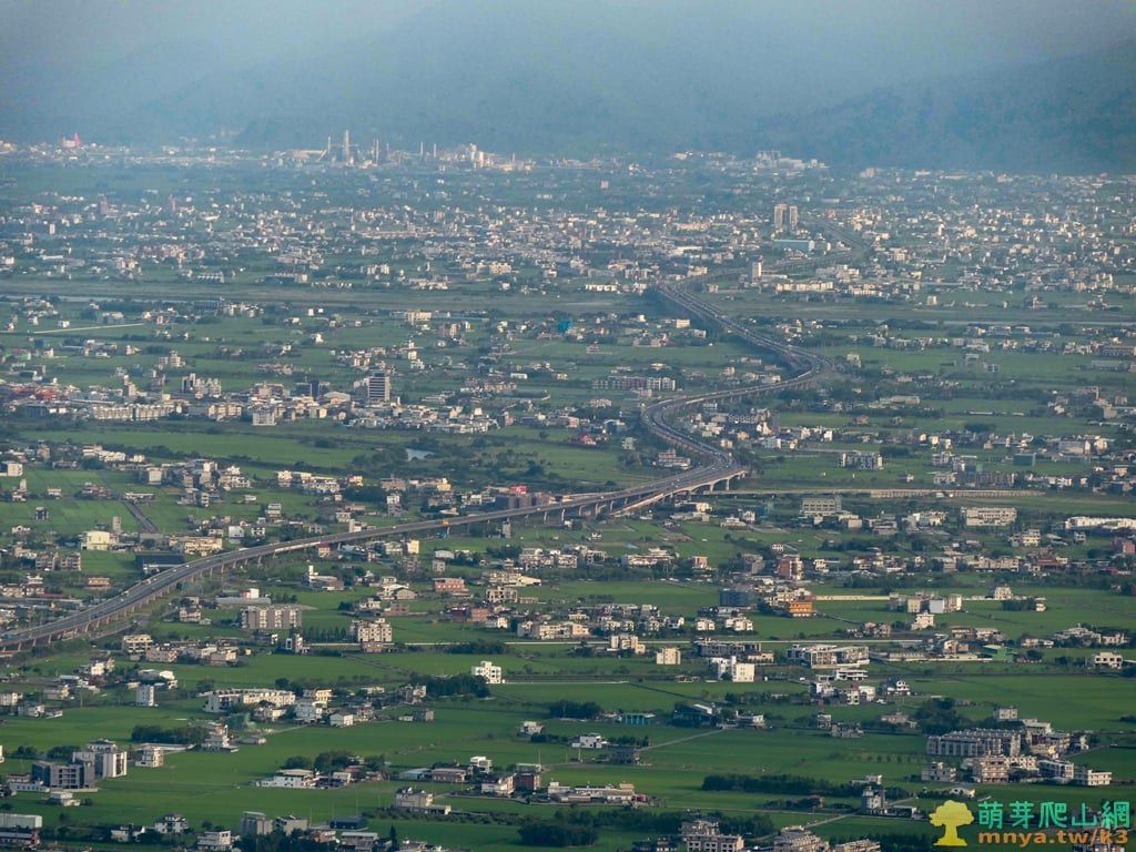 ▲拉近往西南眺望平原西側的層層山稜,由近依序可見匏崙山(莿子崙庄;356M);鎮頭山(307M)、大湖山(438M);貢仔子湖山(390M);大安埤山(415M)、三針後山(815M)。