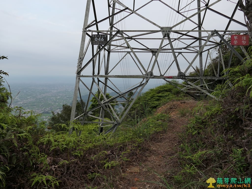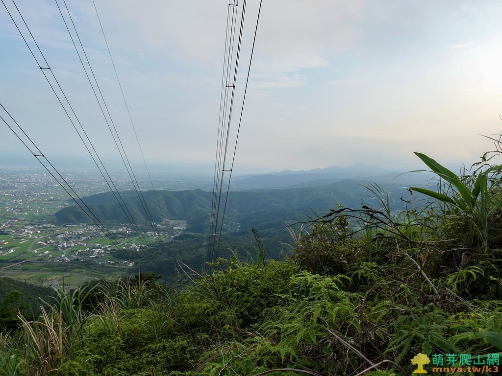 ▲五峰旗山東南峰山頂之前草坡展望,往南俯瞰蘭陽平原,下方可見剛才經過的第二處電塔(坪林-員山線046)。