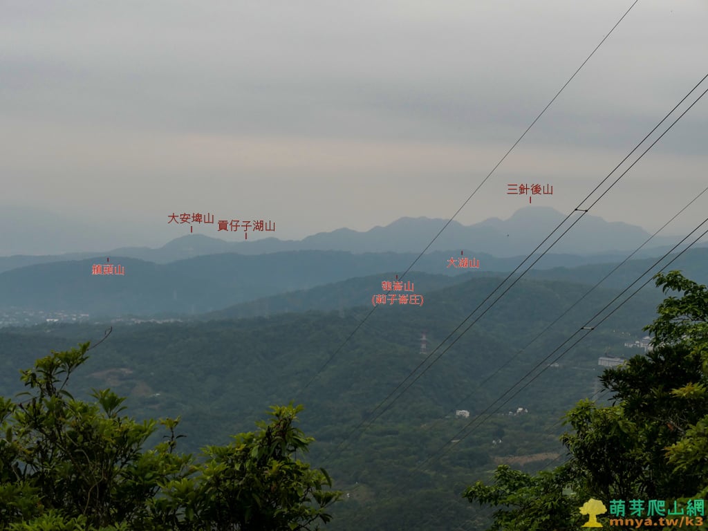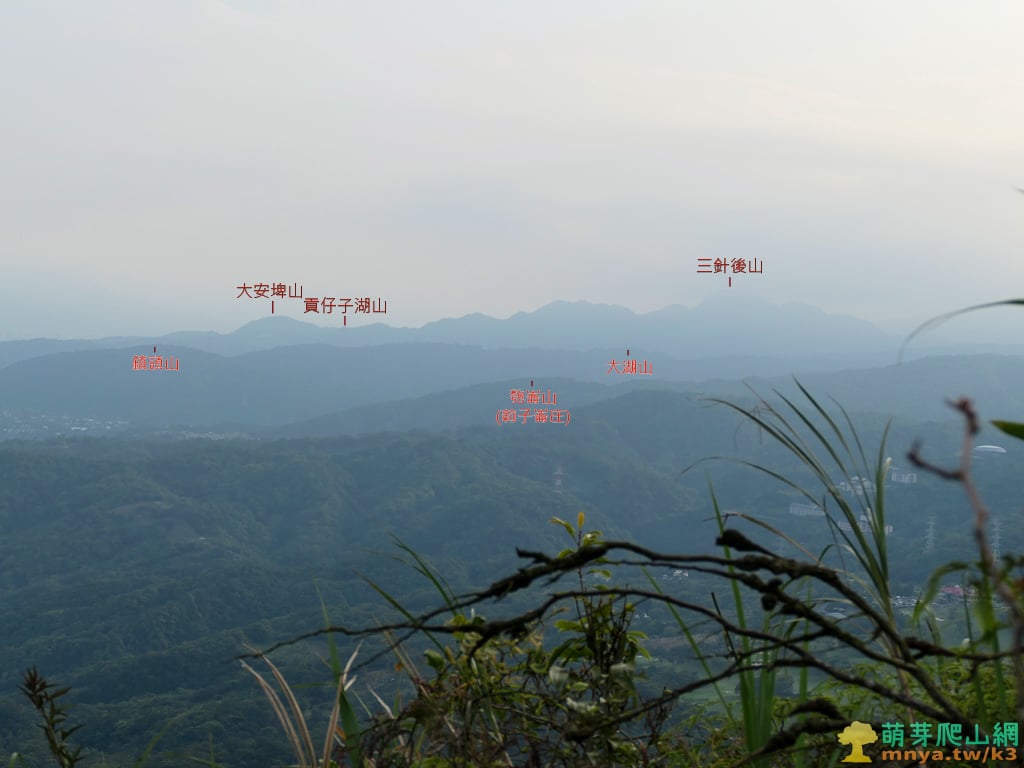 ▲拉近往西南眺望層層山稜,由近依序可見匏崙山(莿子崙庄;356M);鎮頭山(307M)、大湖山(438M);貢仔子湖山(390M);大安埤山(415M)、三針後山(815M)。