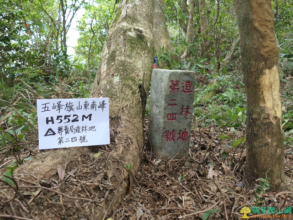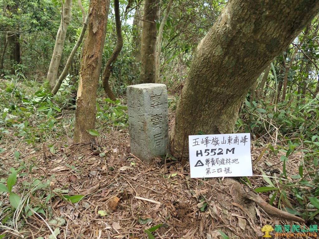 五峰旗山東南峰 標高552公尺 大正十一年十一月建設專賣局造林地第24號 座標:325892, 2748628;24.8413784 121.7590817