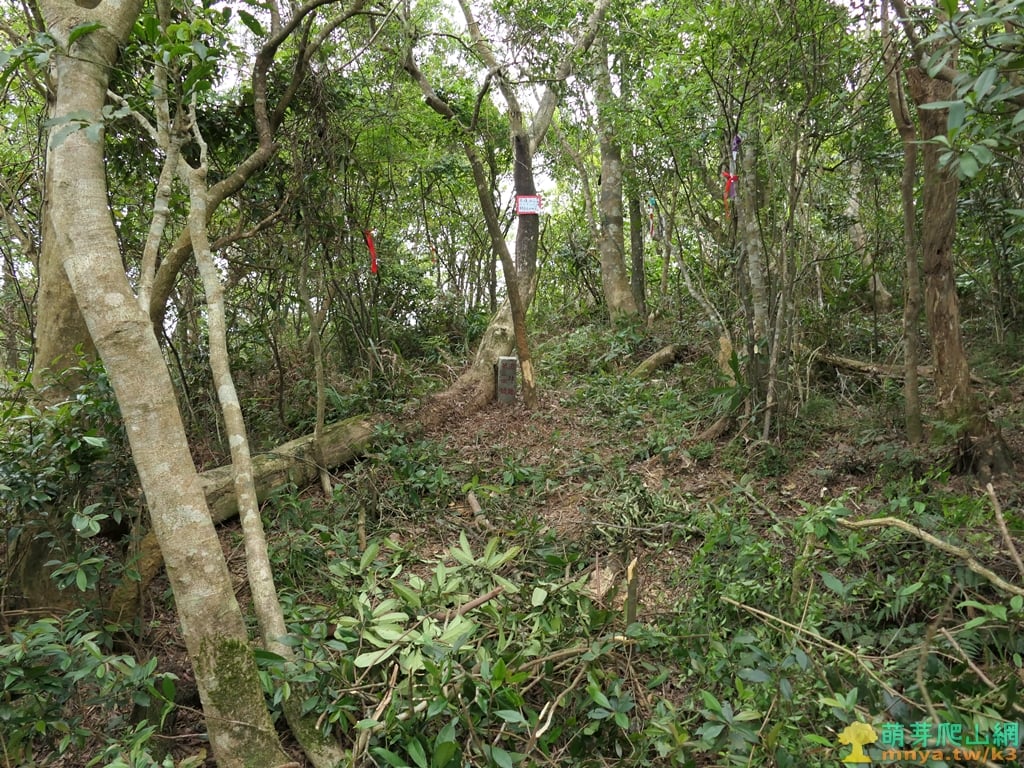 ▲另一角度可見山頂牌,四周林木茂盛無展望。17:45,拍完照後原路折返。