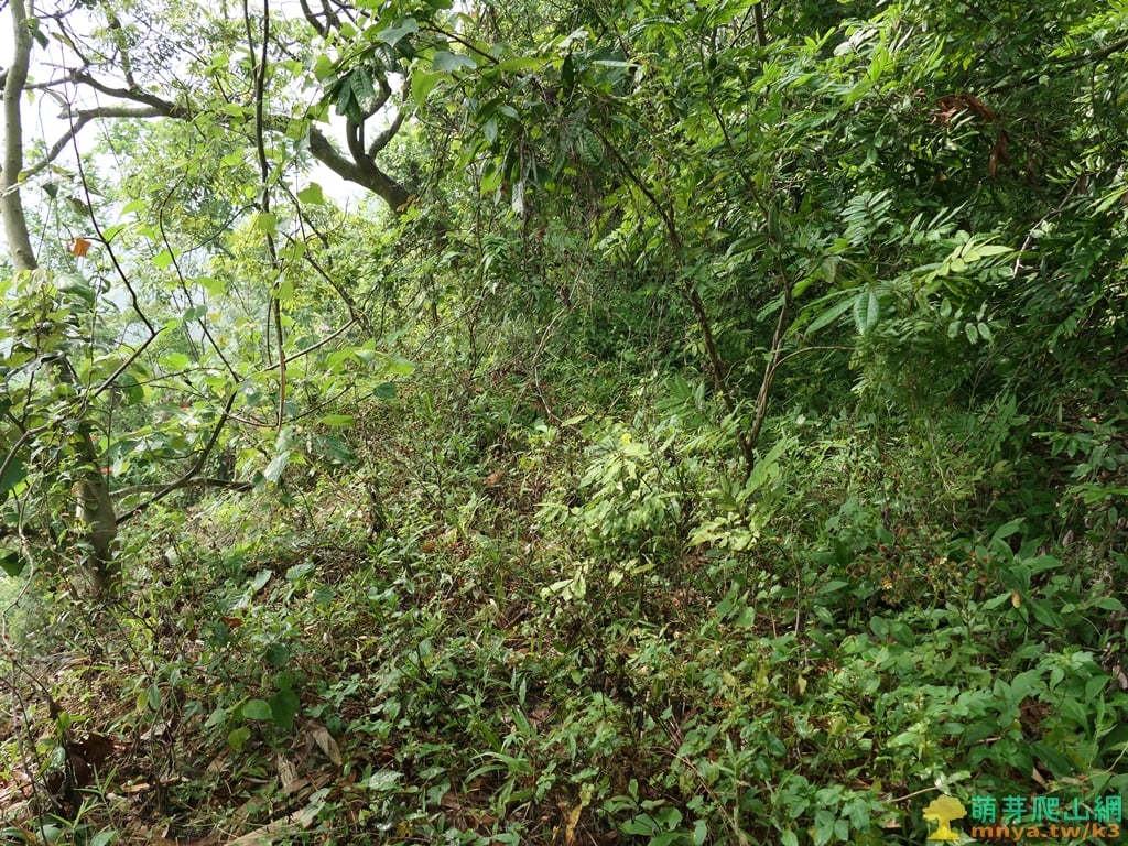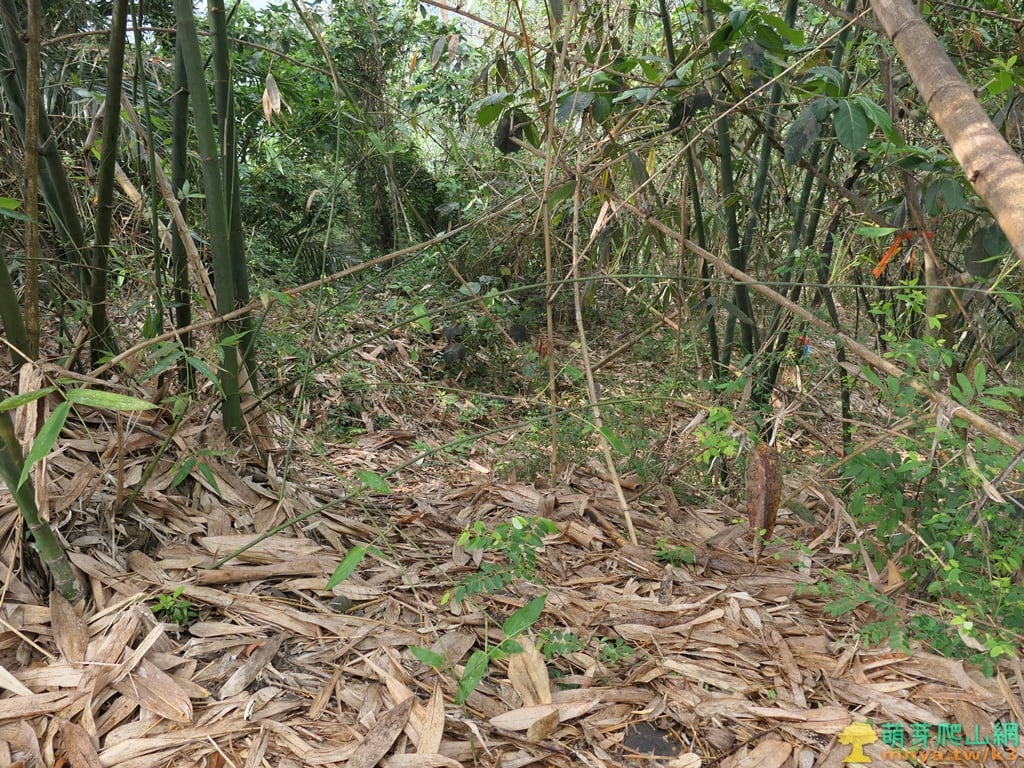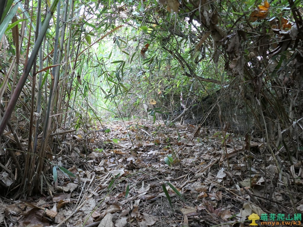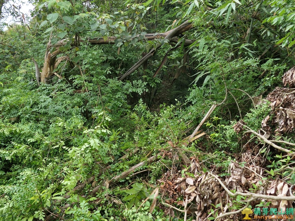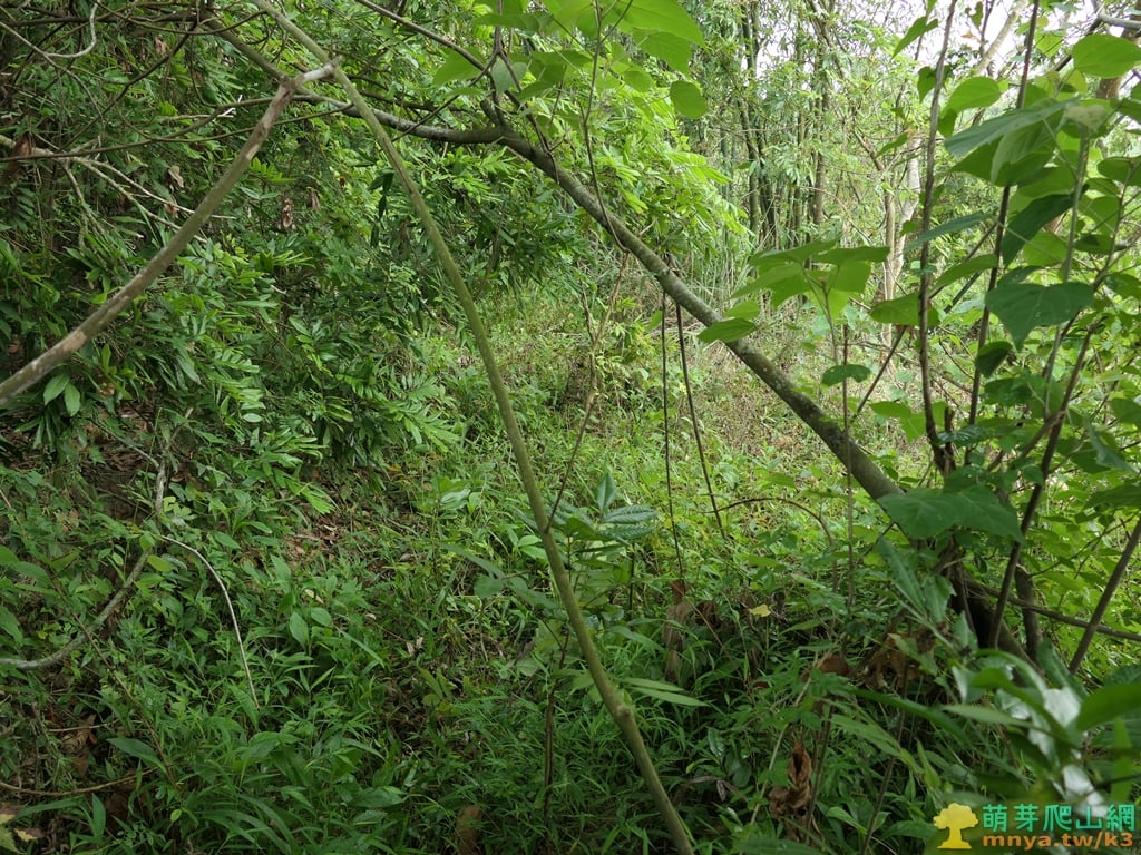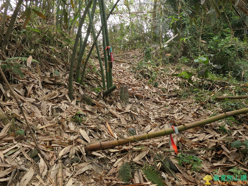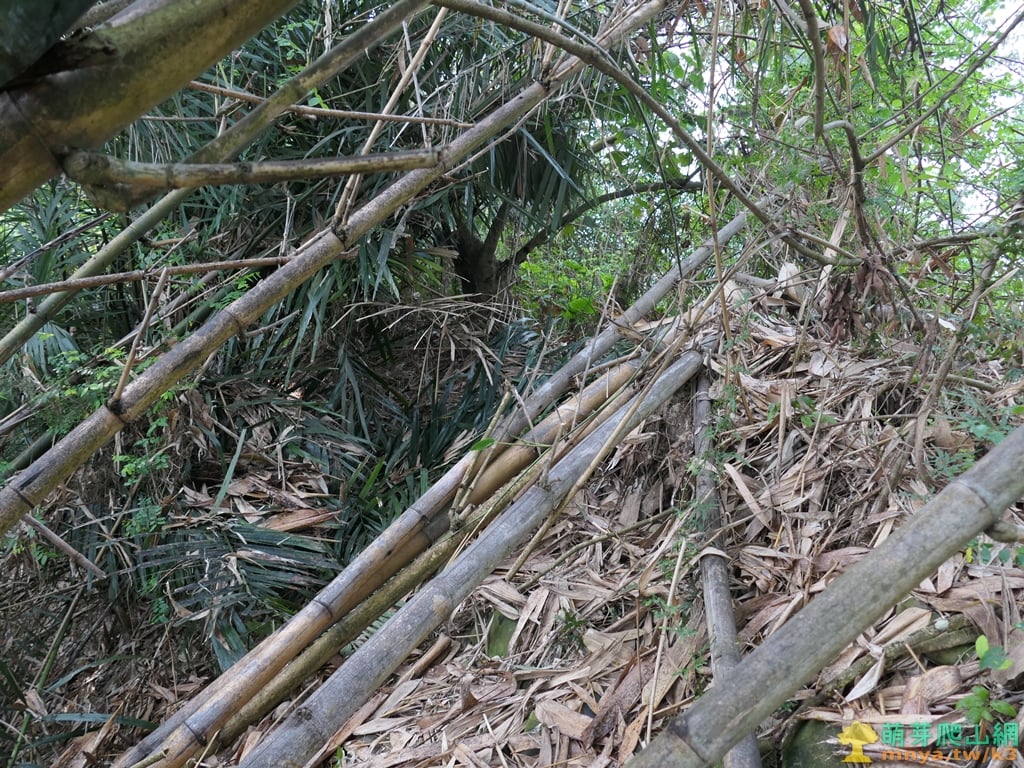 ▲再往前稜線被倒竹、山棕叢橫阻難行,從左跨越清理出一條小徑。(回程補拍)