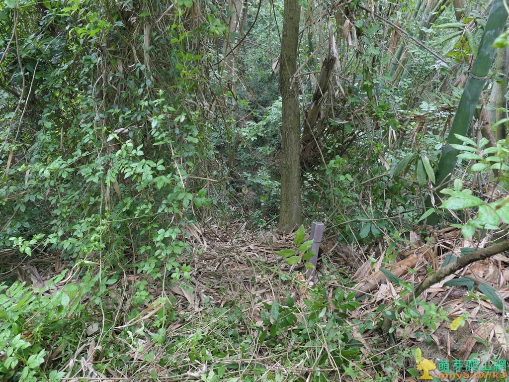 ▲鑽過莿藤叢後於竹叢邊有一根土地界標,取直順稜下切轉為窄稜地形。