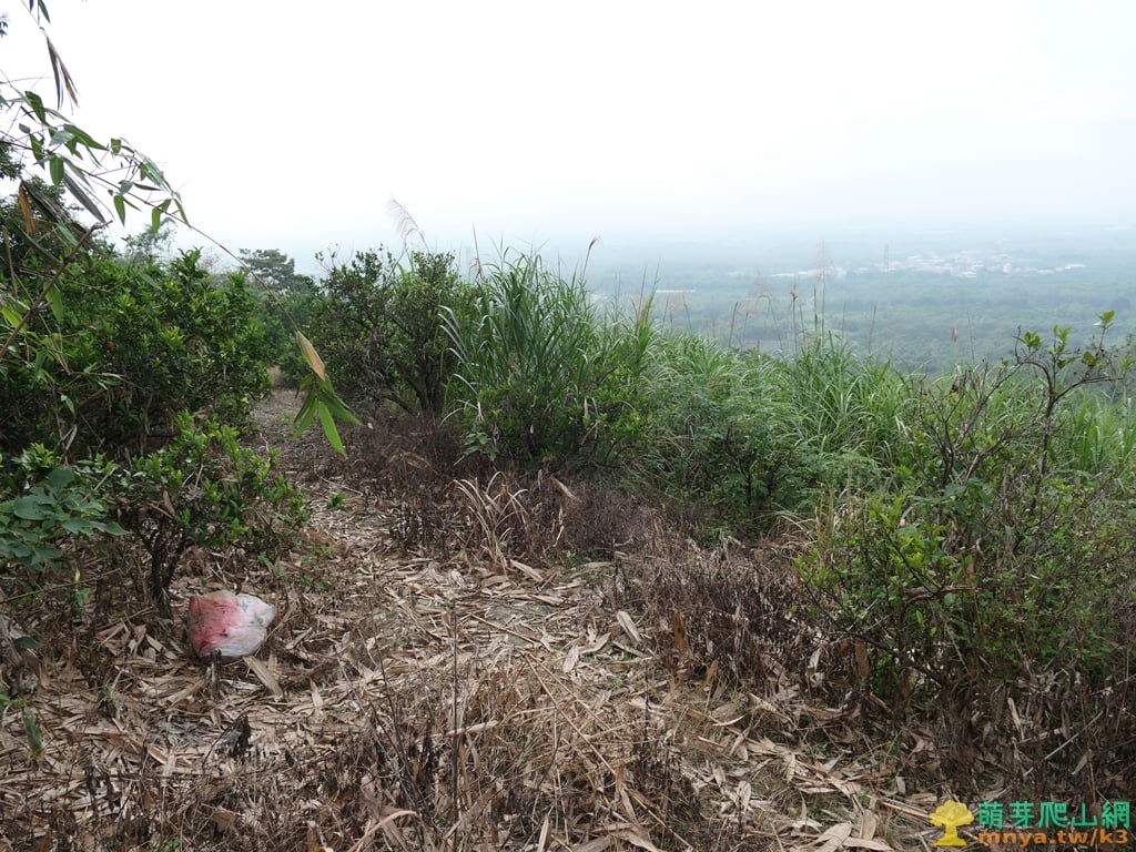 ▲原路走稜線回棋盤厝山內導點,右側可見荒廢已長滿芒草的果園。