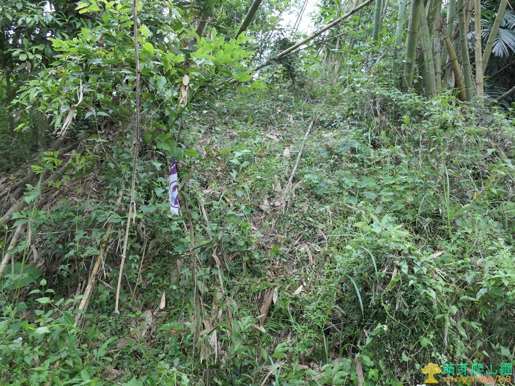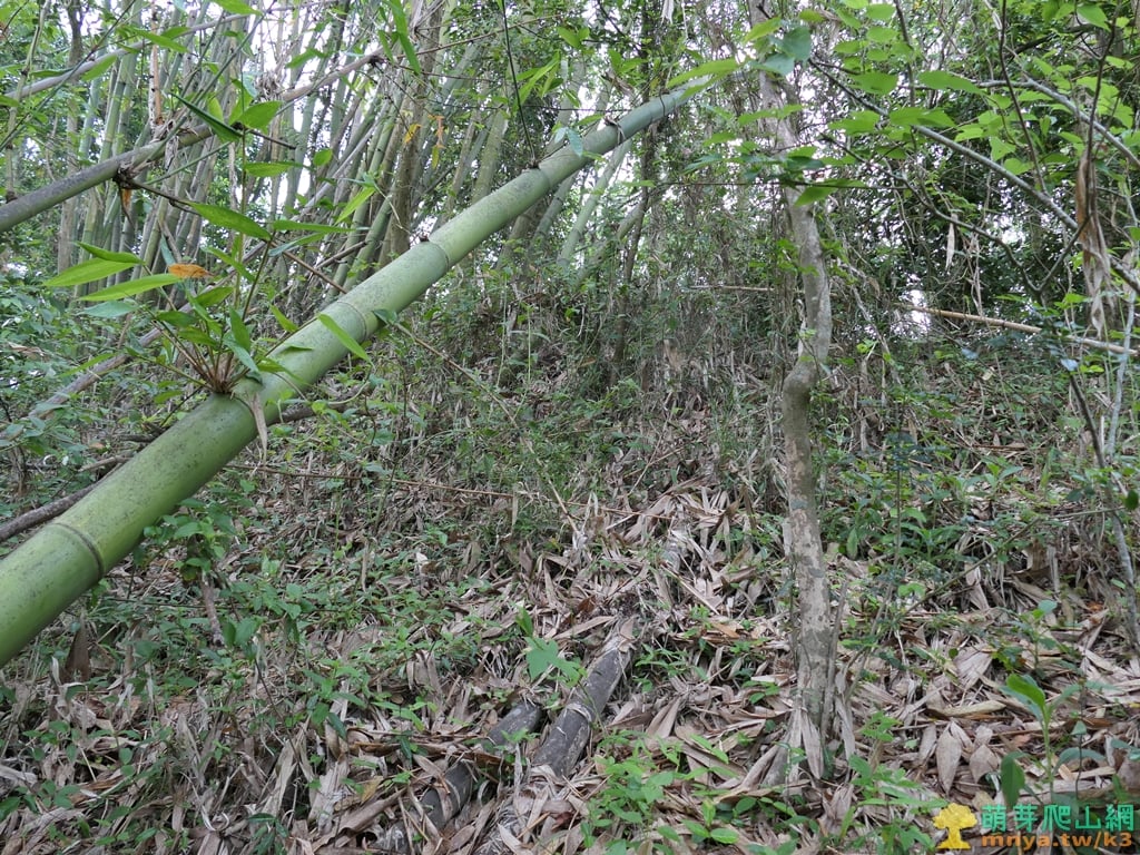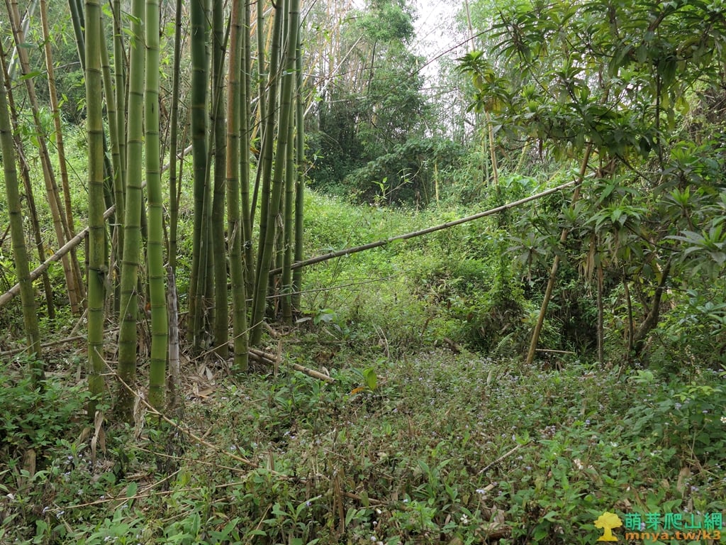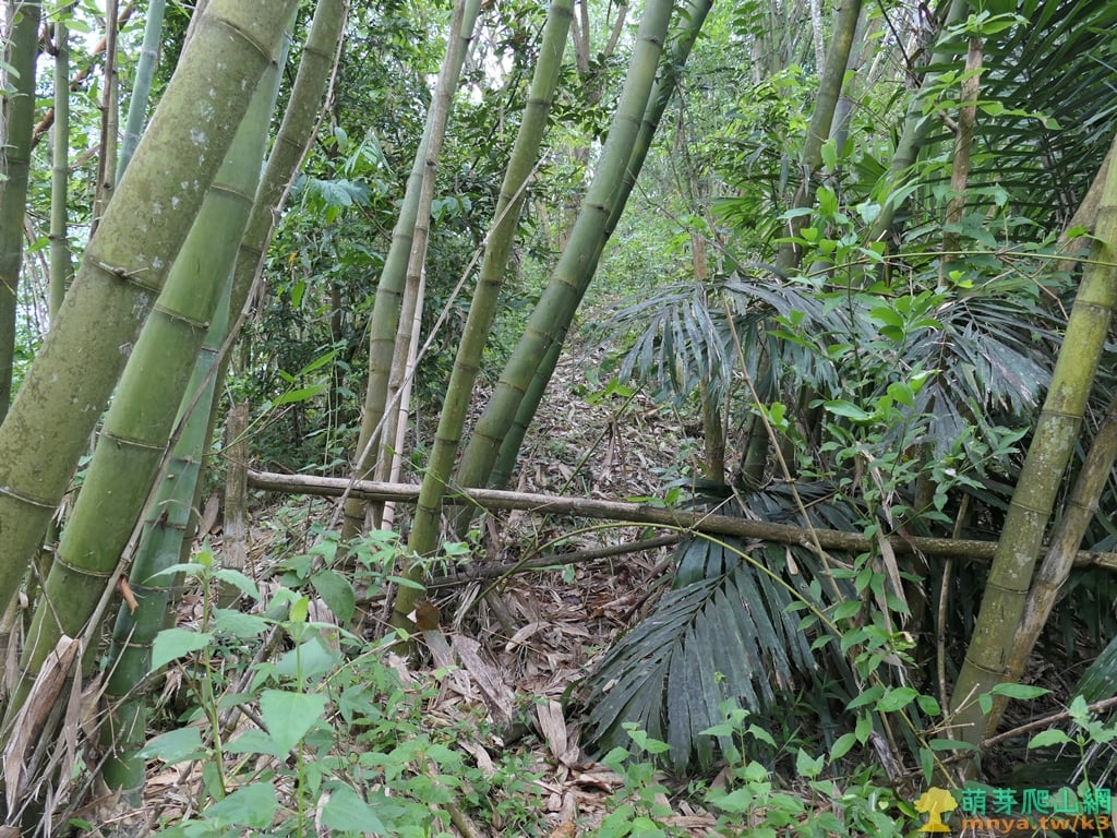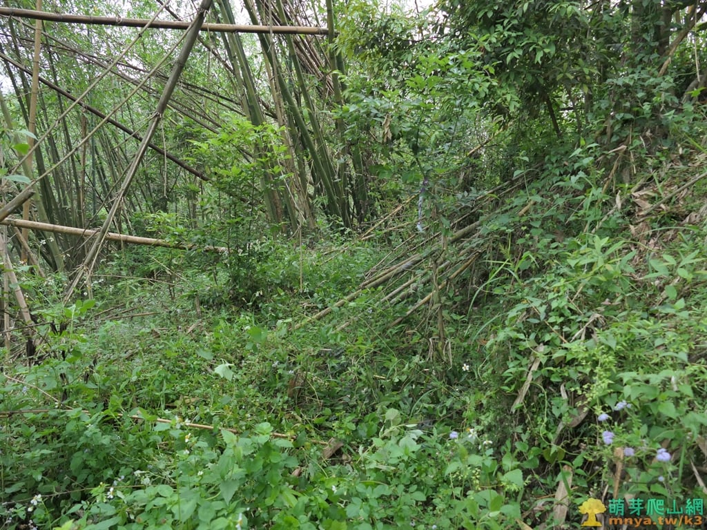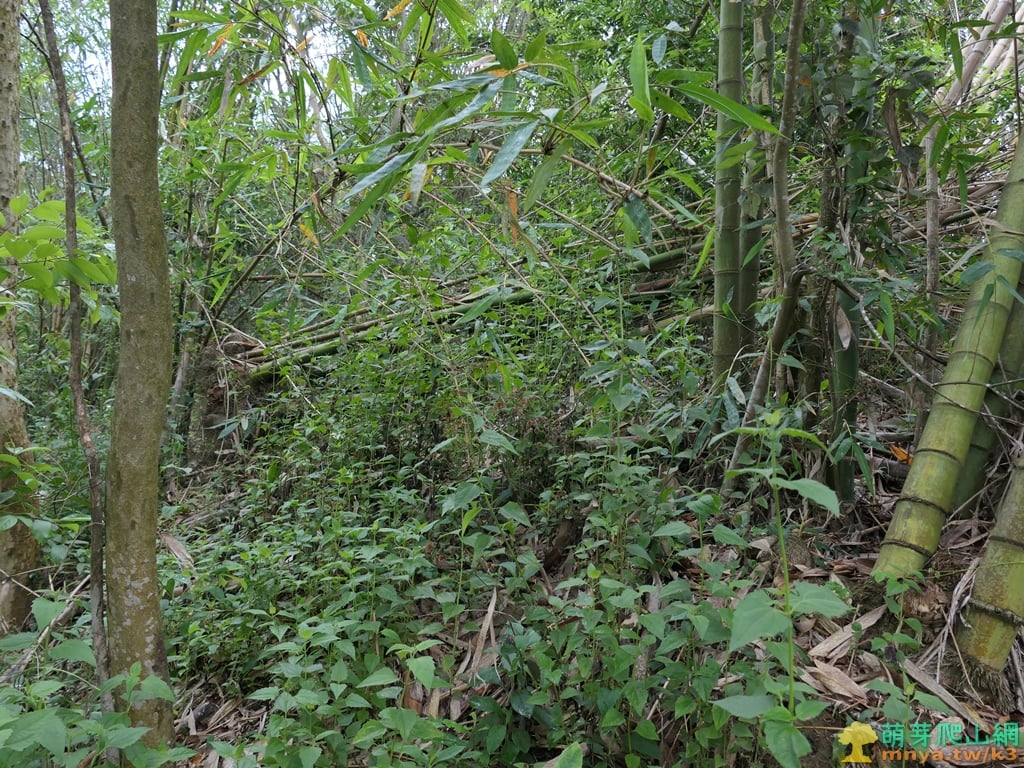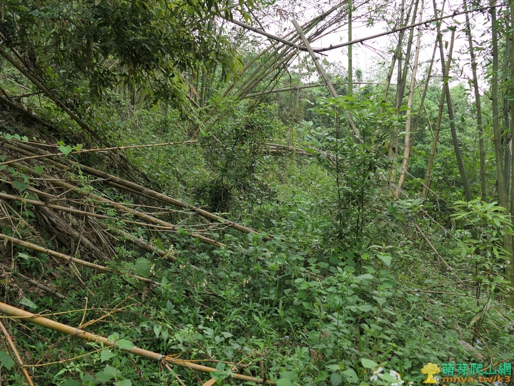 ▲上高點前遇倒竹叢從左側繞過,山坡雜草還算稀疏稍微清理一下便可通過。