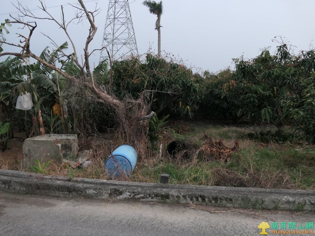 ▲與基石相鄰是一片芒果園,南邊有一座電塔,基石旁有一藍色膠桶。