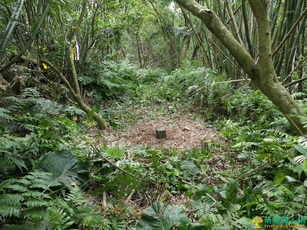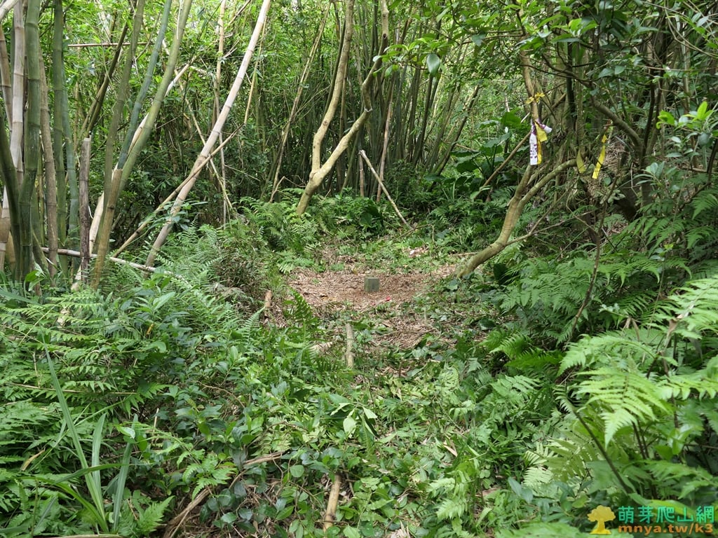▲於蕨草叢間、竹叢梯田平台見尾崙山北市都計基石,從圖根點處走來5分鐘。