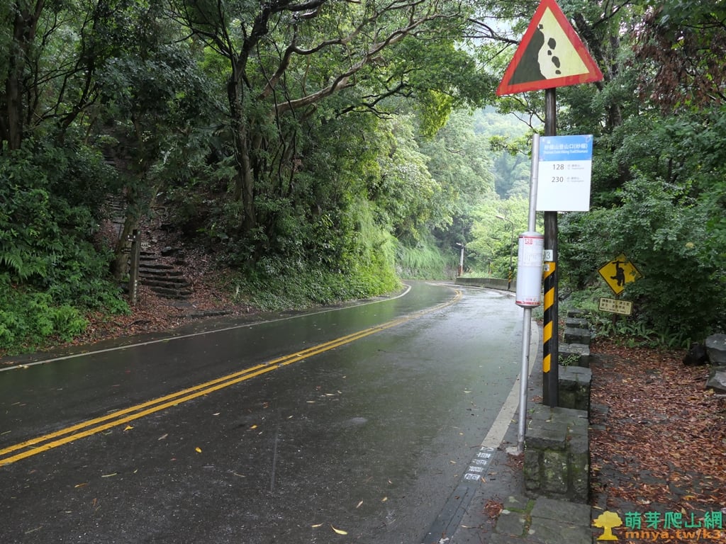 ▲一陣強勁的午後雷陣雨過後來到紗帽山大埔登山口,路口公車站牌「紗帽山登山口(紗帽)」有128、230號班次往陽明山,登山口有指標往紗帽山頂1.0K;續行紗帽路往陽明山國家公園遊客中心2.9K。