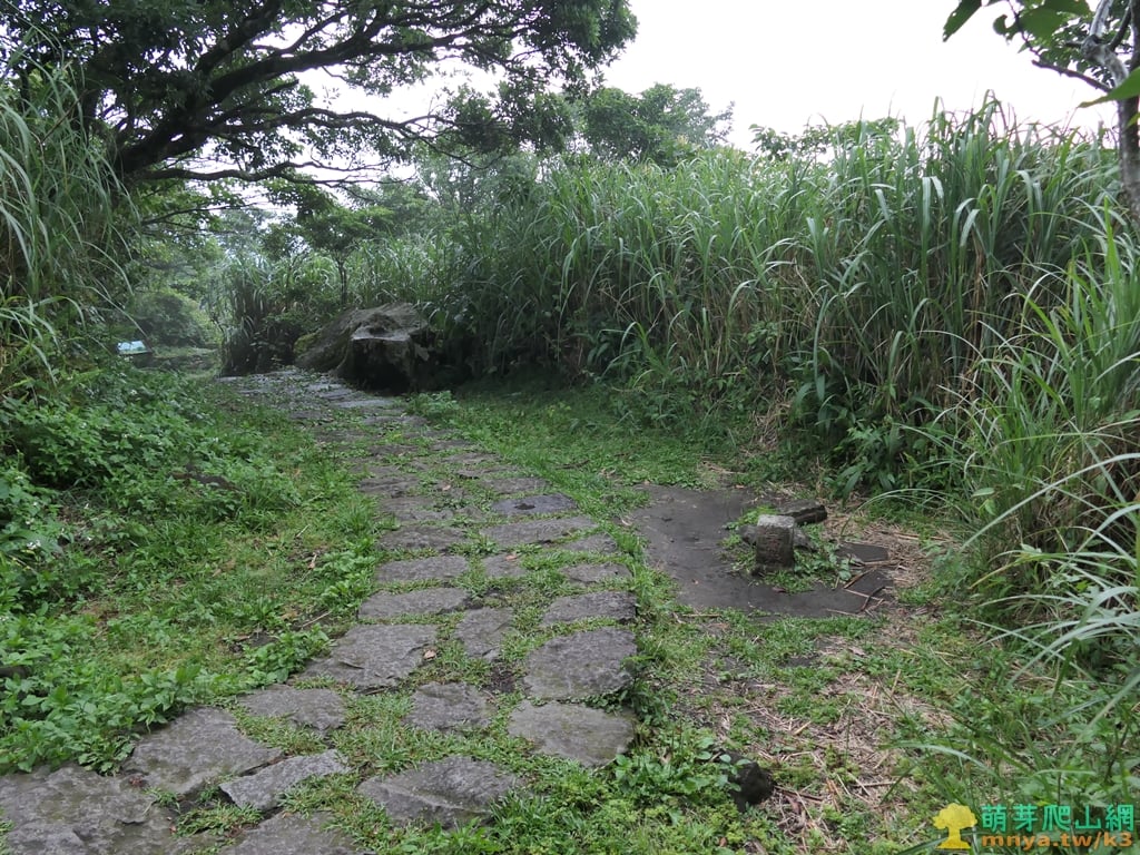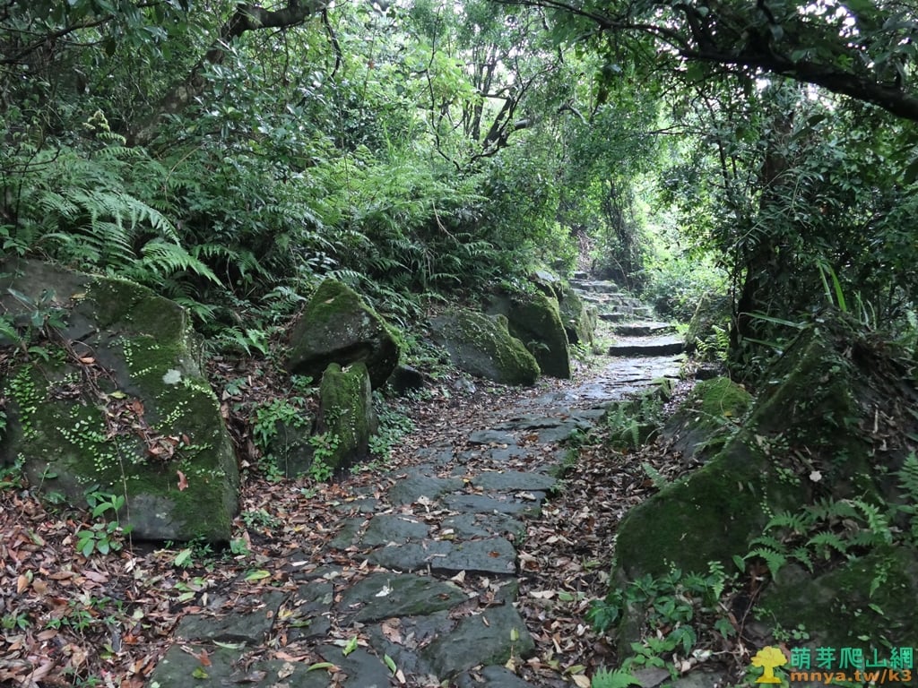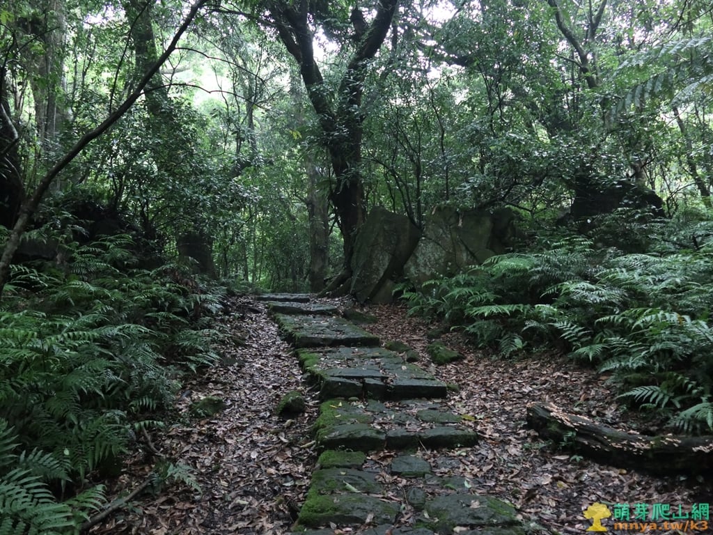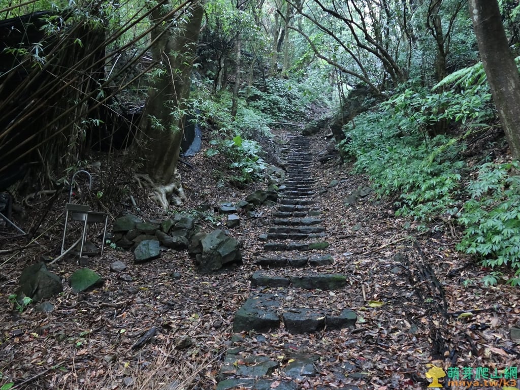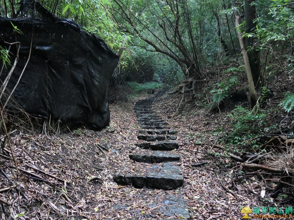 ▲之字形步道上行經亂石堆,前方坡度減緩、左彎後便抵達山頂前的太子亭遺跡。