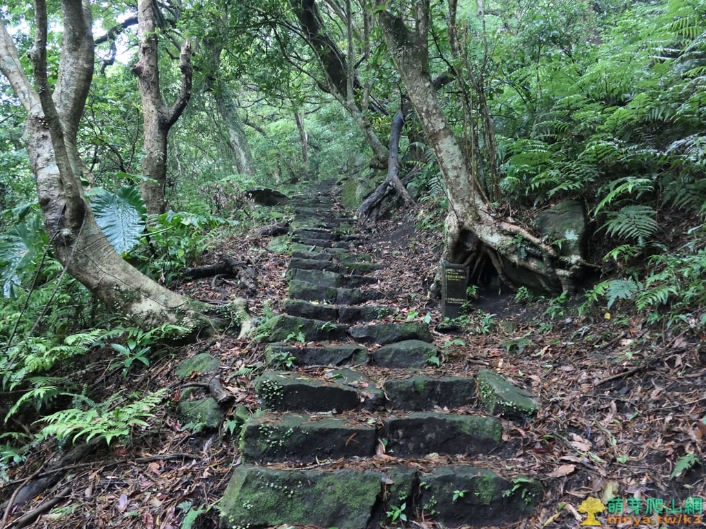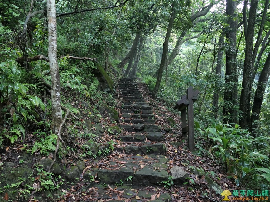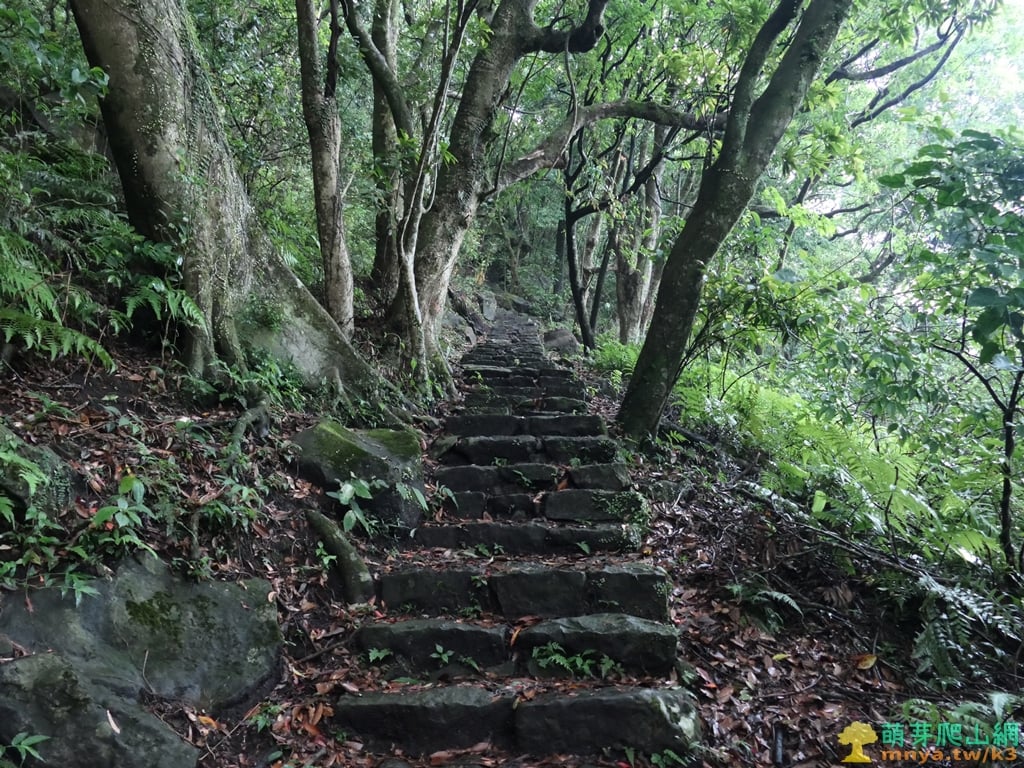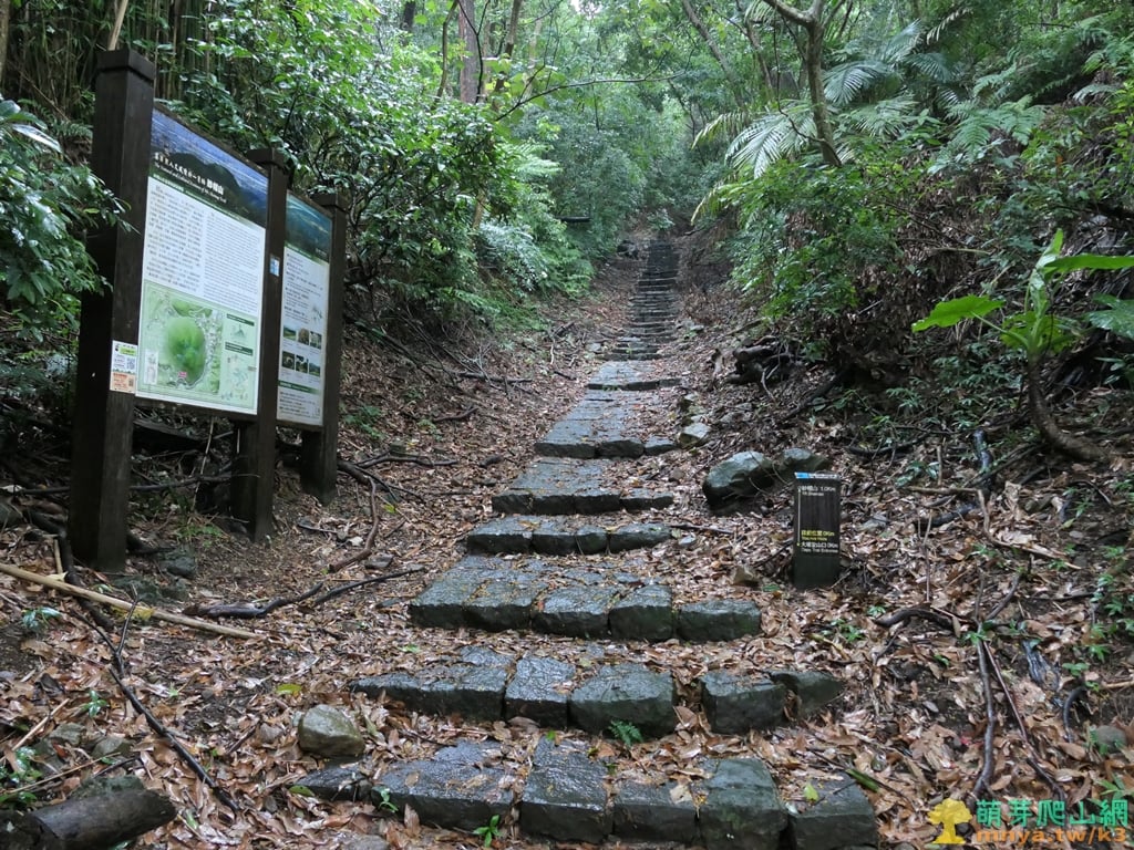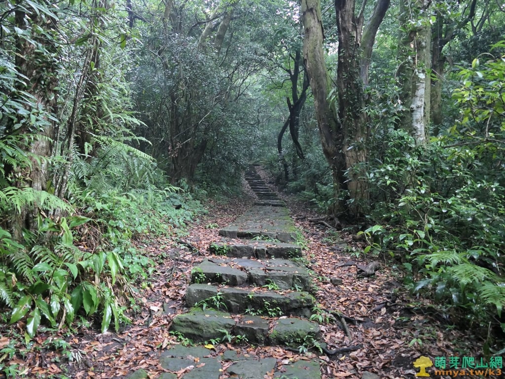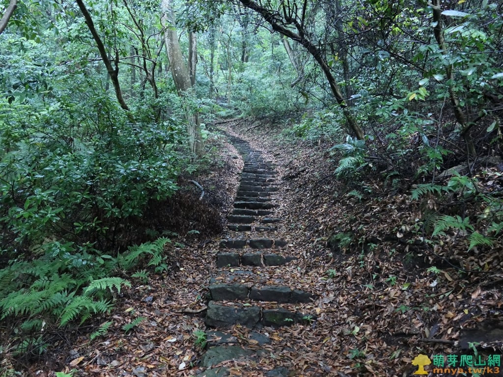 ▲之字形步道上行經亂石堆,前方坡度減緩、左彎後便抵達山頂前的太子亭遺跡。