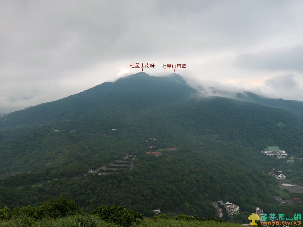 ▲拉近眺望七星山南峰(1090M)、七星山主峰(1120M)、七星山東峰(1107M),主峰位於火山錐的中心,是台北市的最高峰。