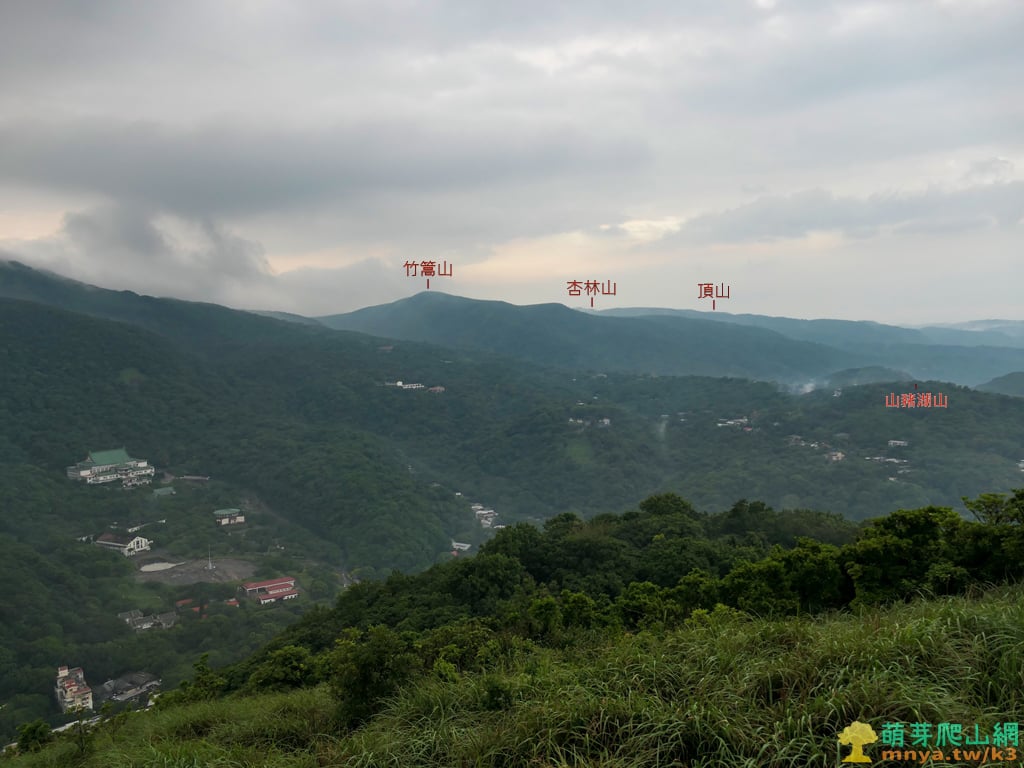 ▲往東眺望擎天崗方向,遠可見竹篙山(831M),與杏林山(800M)、頂山(768M)延伸往風櫃嘴之稜線,前方可見山豬湖山(572M)。