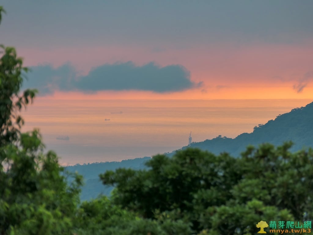 ▲日落之後的大屯火山群,可見向天山(946M)、大屯山西峰(983M)、大屯山南峰(959M)、大屯山(1092M)與竹子湖山(701M),此時大屯山頂的民航局大屯山助航台已從雲霧中露出。