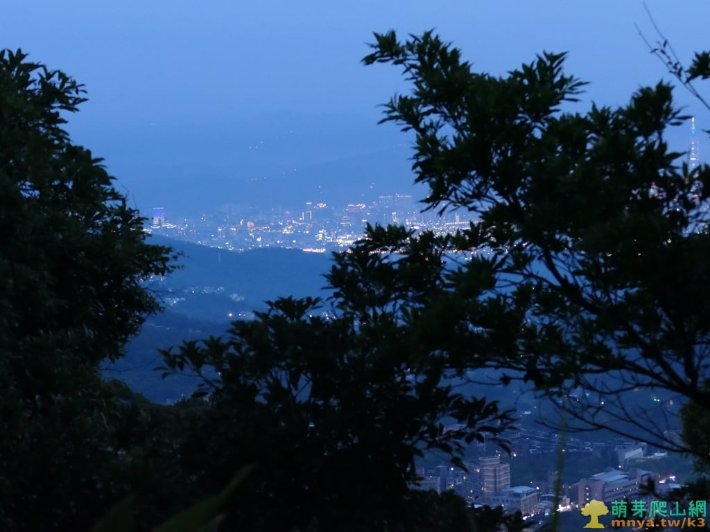 ▲太子亭遺跡處樹林間的展望,可眺望臺北盆地都市夜景,略可見台北101大樓。