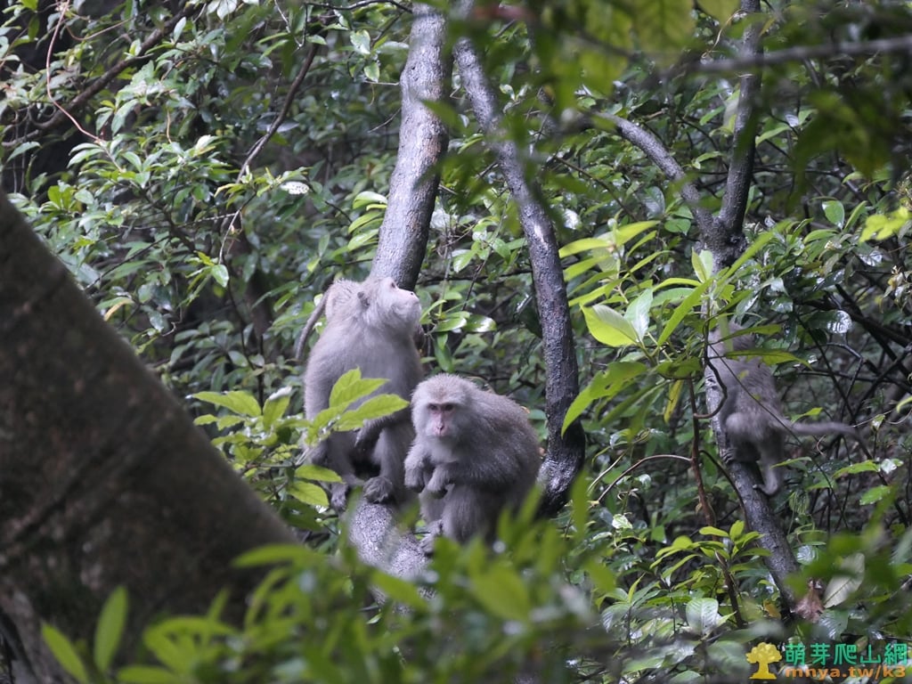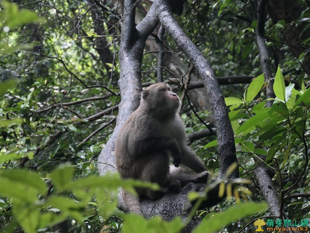 ▲開始順著山坡石階步道之字形爬坡,前方樹林間突然冒出二、三十隻的猴群,數量驚人且完全不怕人。