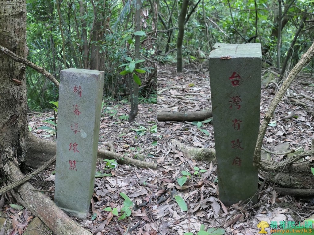 ▲15:12,上山坡高處平台見台灣省政府精密導線點,整根基石裸露靠著樹幹,走至九股山西北峰費時約8分鐘。