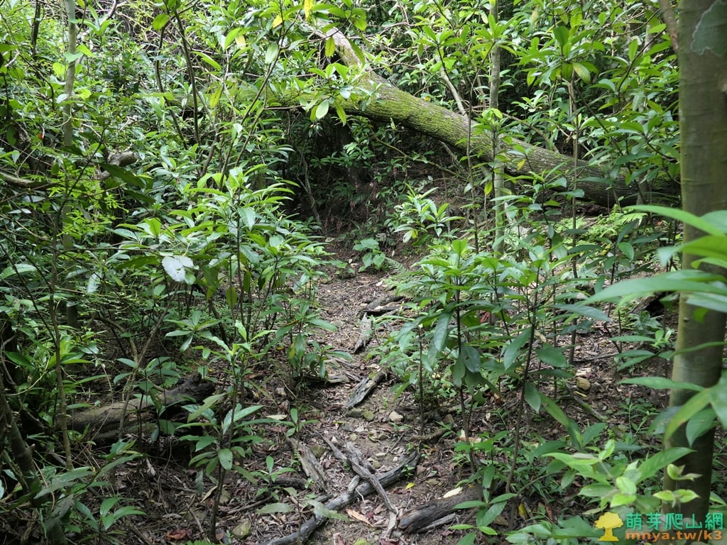 ▲穿越平台地山坡轉陡上坡,跨過橫向樹幹後直上稜線。