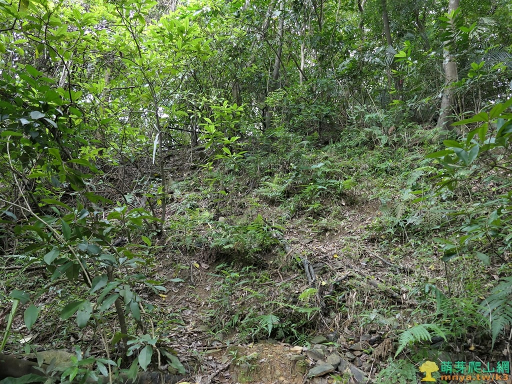 ▲陡上一段山坡接上方稜線取右轉向南行,這段是全程坡度最陡的一小段路。