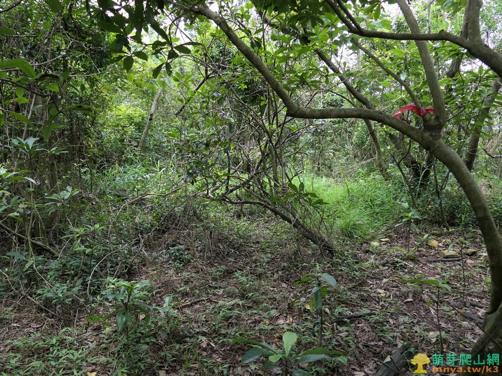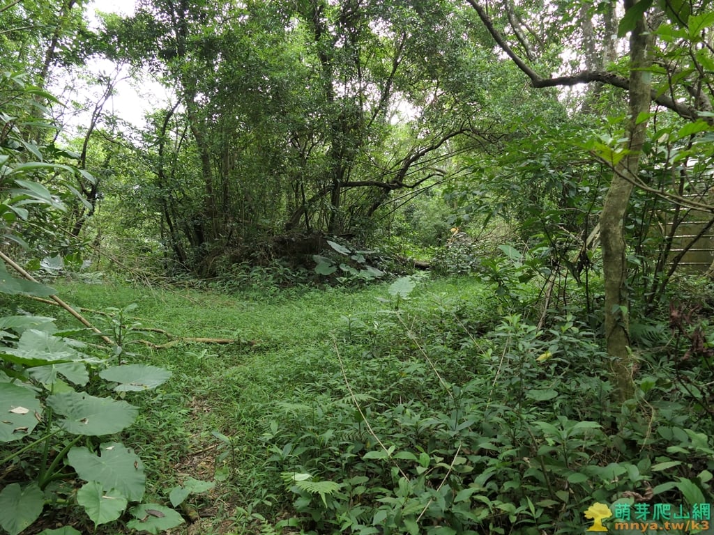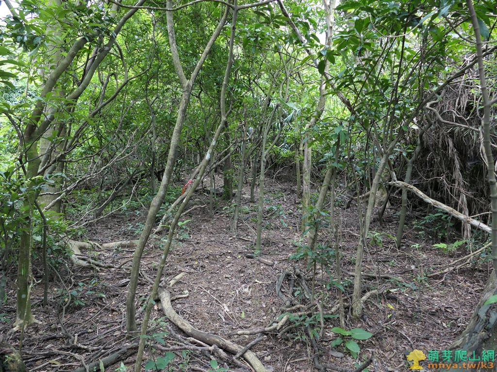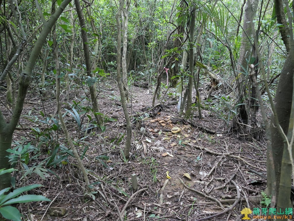 ▲右彎後土路進入一片寬敞平台地,雜木林下路徑較不明顯,往東循著路條行。