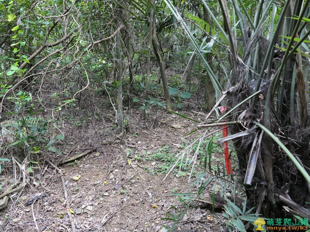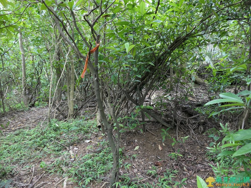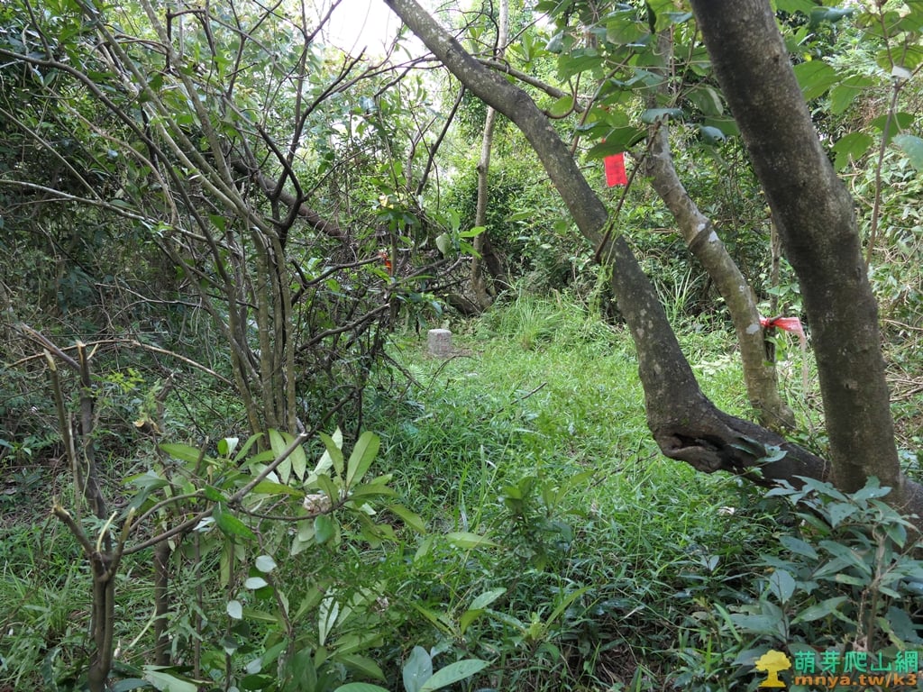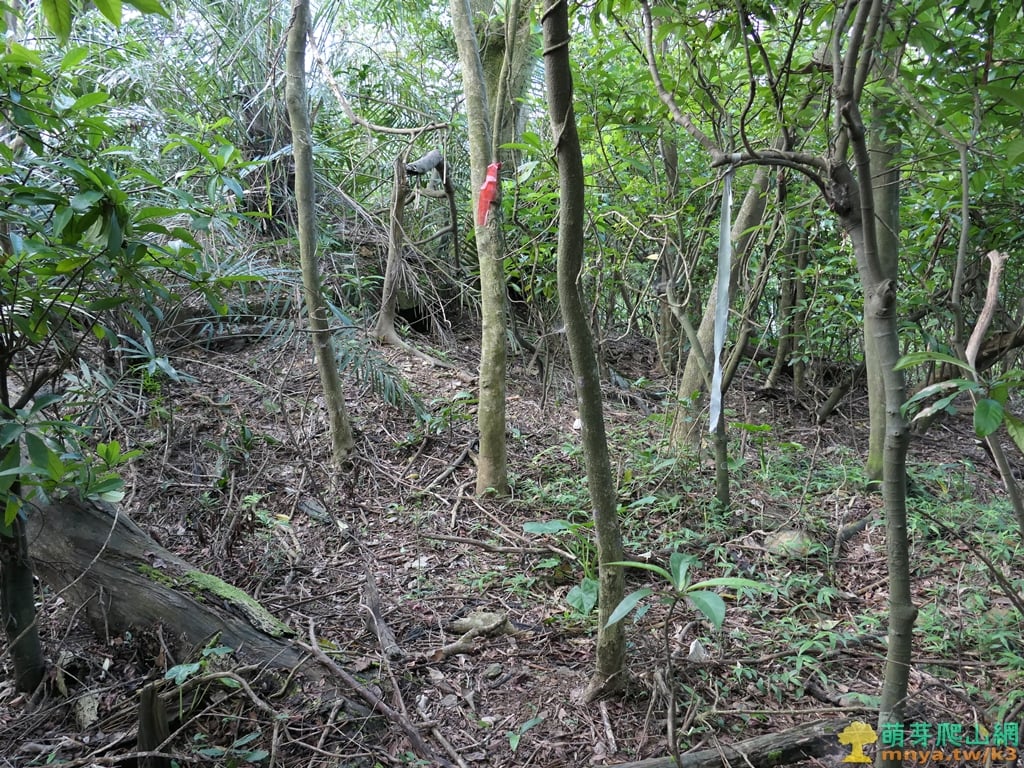 ▲右彎後土路進入一片寬敞平台地,雜木林下路徑較不明顯,往東循著路條行。