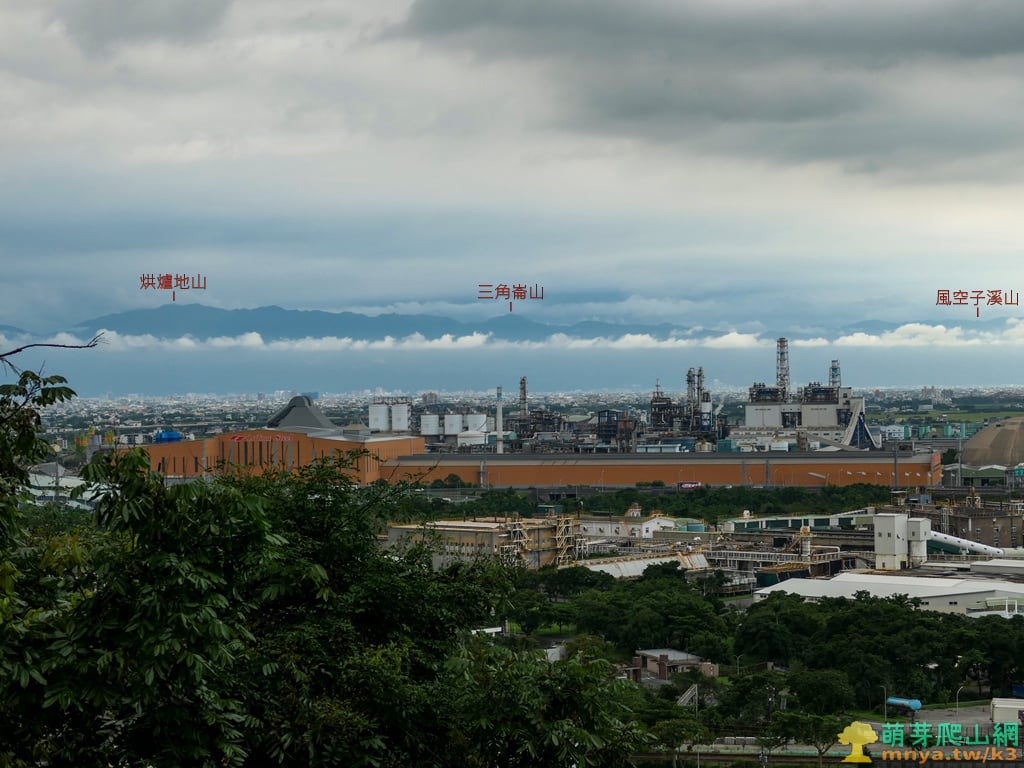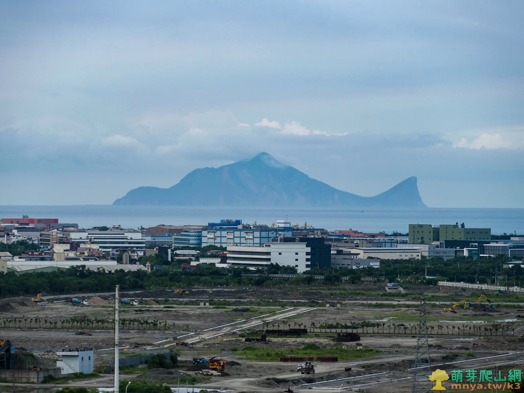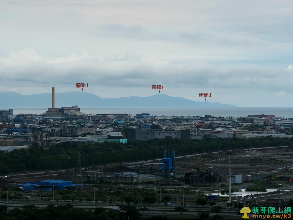 ▲拉近看國道五號蘇澳端旁的龍德工業區廠房,遠眺蘭陽平原北邊的雪山山脈,由南向北可見烘爐地山(1167M)、三角崙山(1029M)、風空子溪山(908M)等,山邊午後雷陣雨發展旺盛。