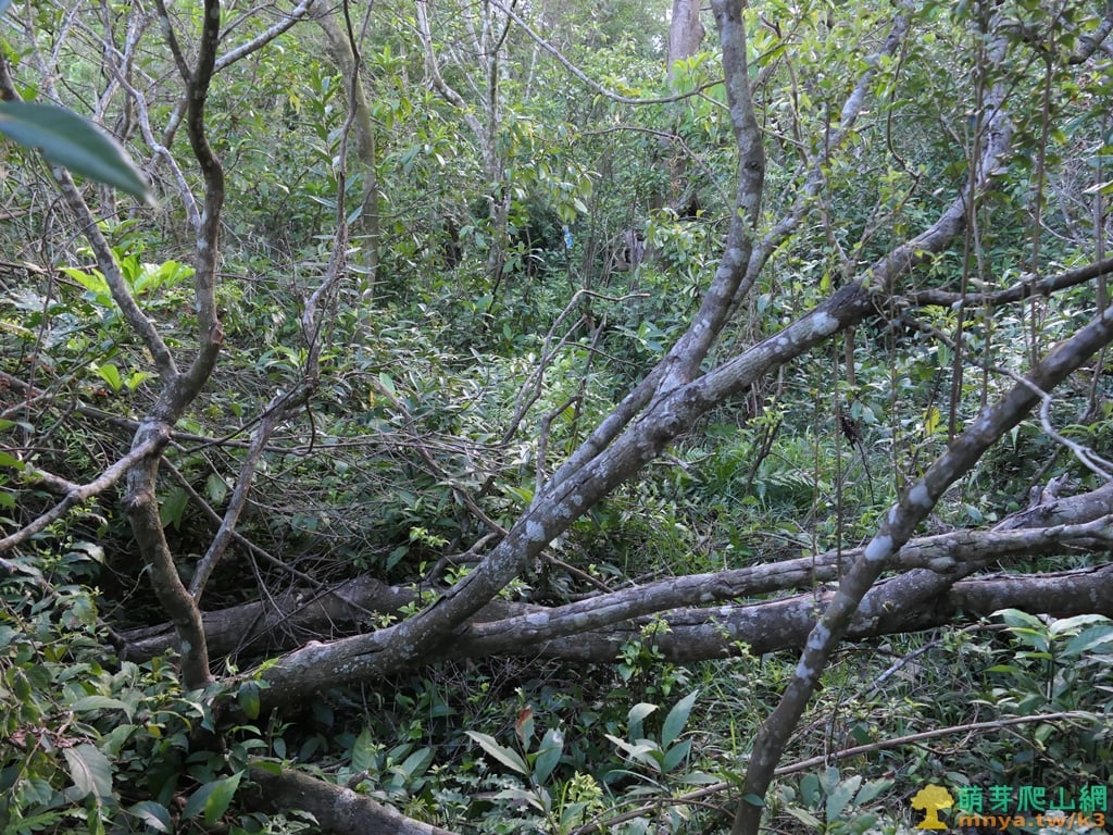 ▲爬坡後跨越倒木,鑽著矮灌木林往回。