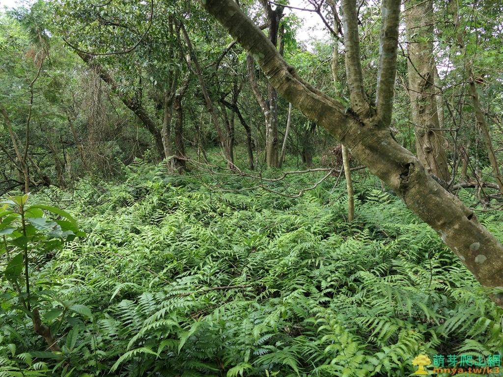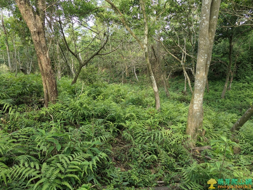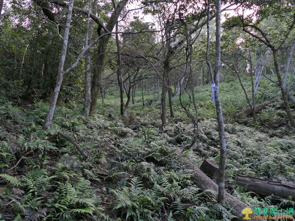 ▲順著山坡緩下往造林地邊界,林下都是矮蕨草叢高至膝蓋左右。