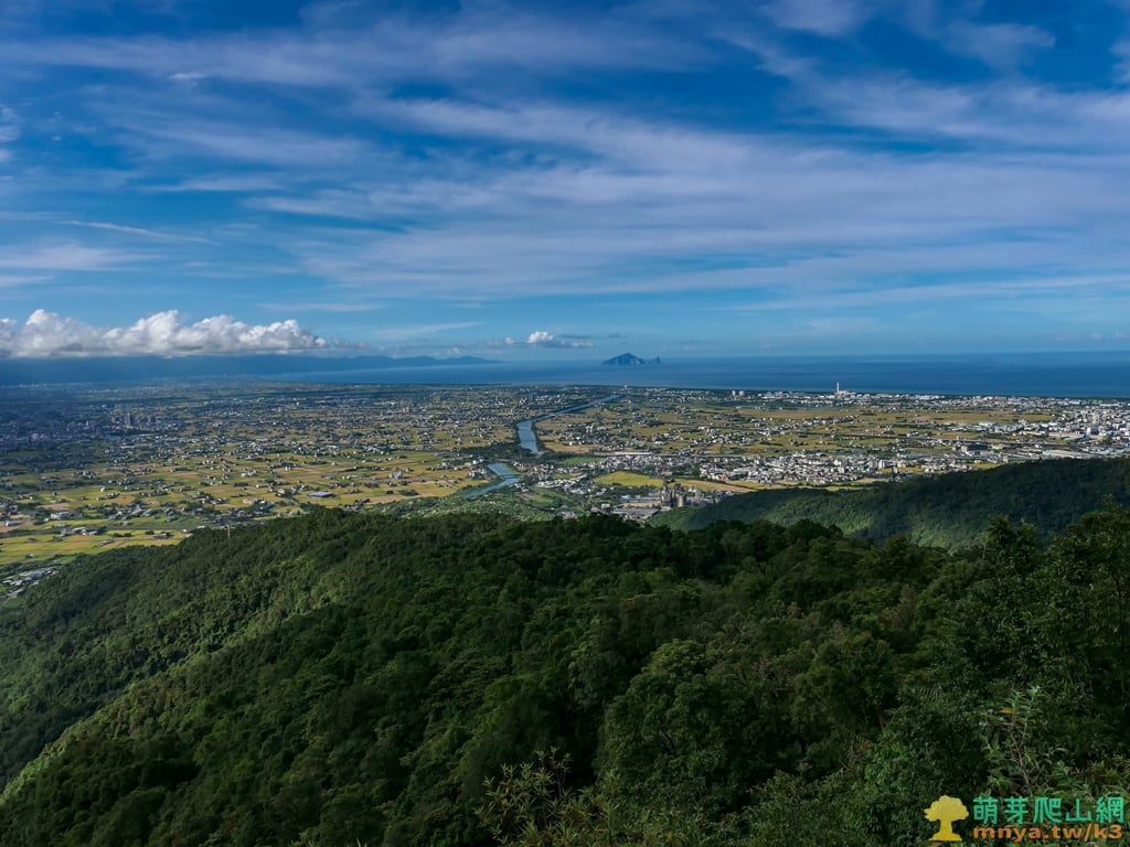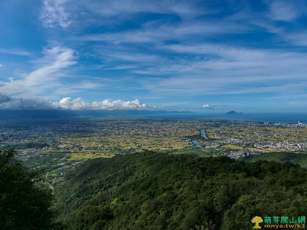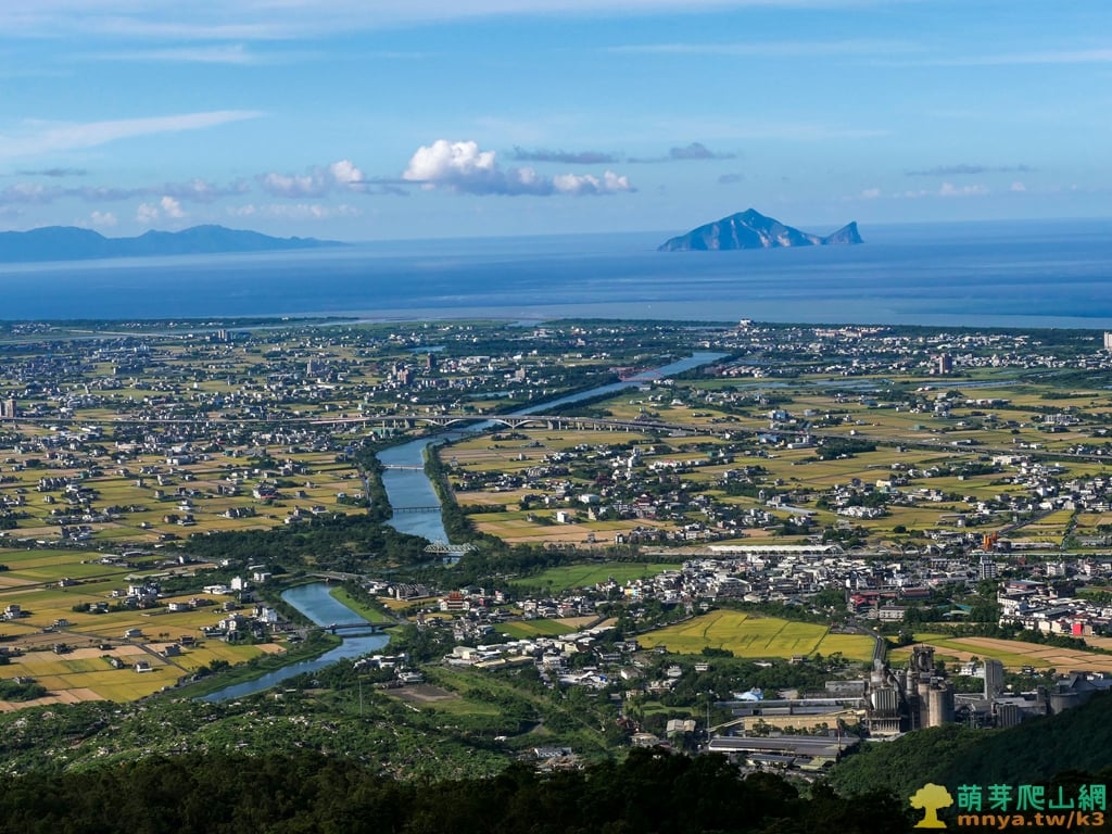 ▲俯瞰蘭陽平原冬山河與冬山市區,遠眺雪山山脈延伸往三貂角,冬山河出海口正對著龜山島。