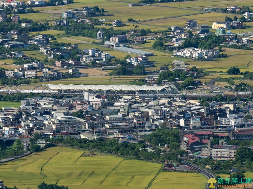 ▲拉近俯瞰台鐵宜蘭線冬山火車站,正好一列快車駛過車站。