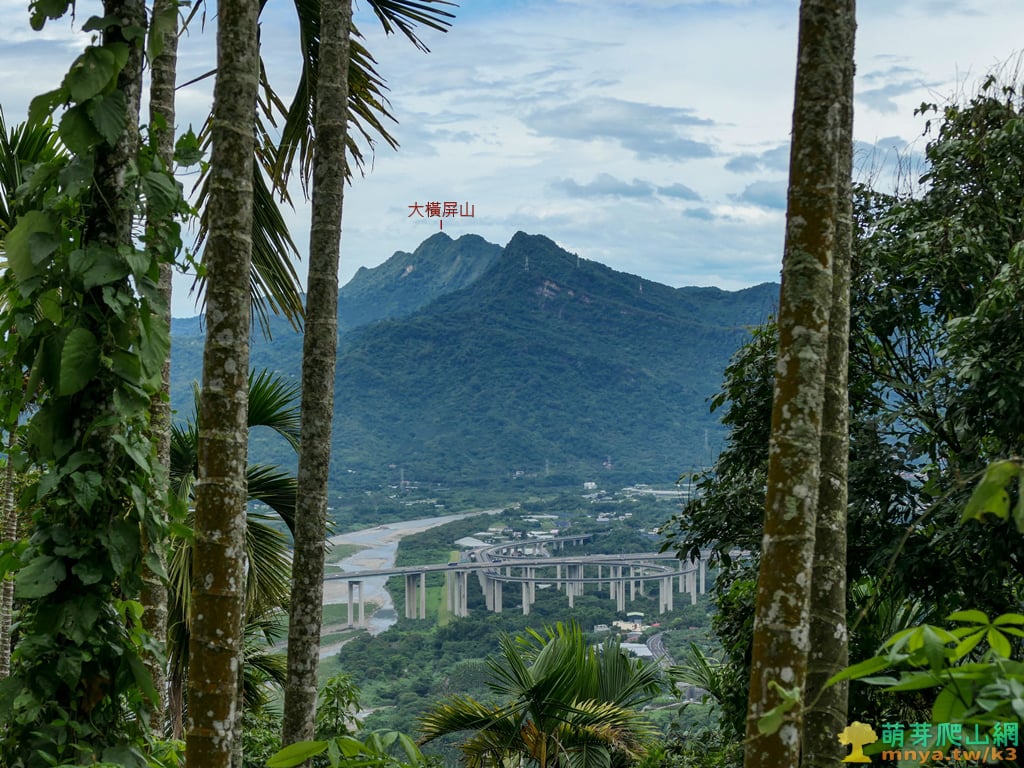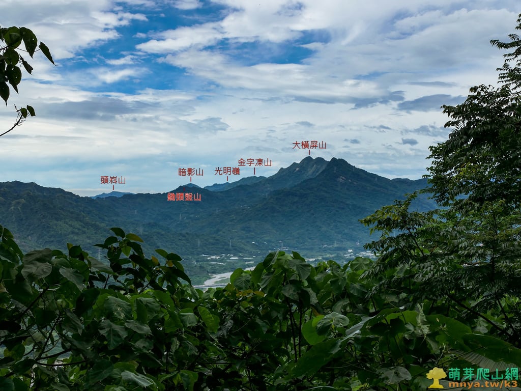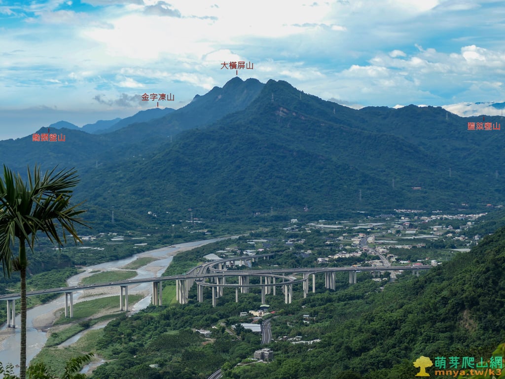 ▲往北拉近眺望大橫屏山(1206M),其山稜南北狹長呈單面山之勢,山稜之左可見鋤頭盤山(730M)、右可見鹽菜甕山(770M),大橫屏山向北延伸之山稜可見金字凍山(1048M)、光明嶺(1051M)、暗影山(997M)。