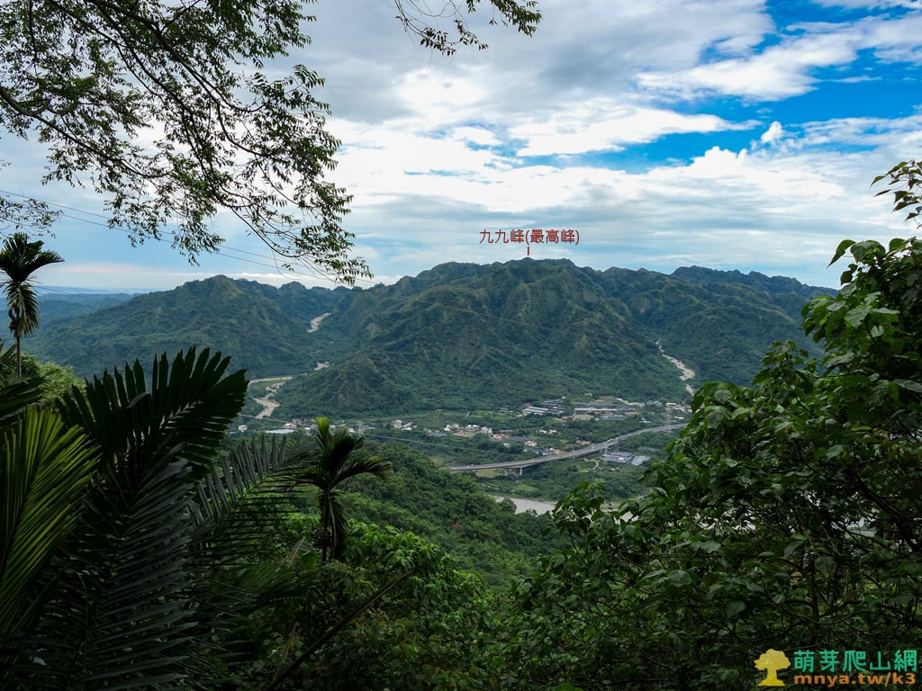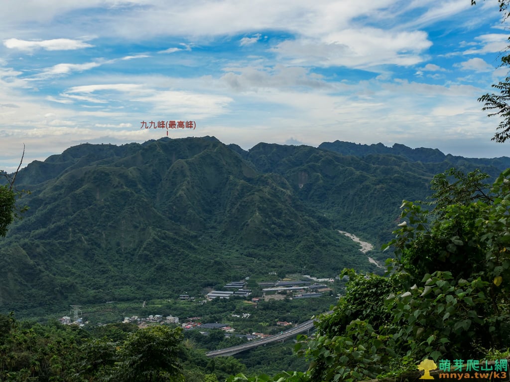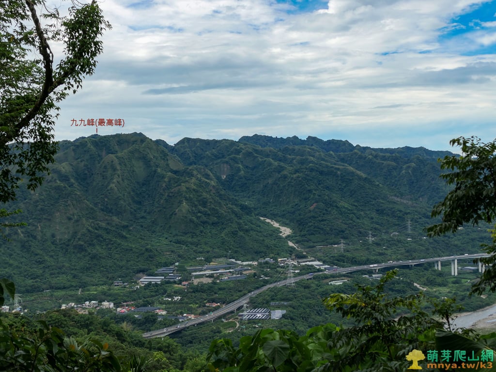 ▲往西北方俯瞰烏溪與國道六號,對面可見深入九九峰的乾溪、田尾坑溪,眺望九九峰最高峰(779M)。