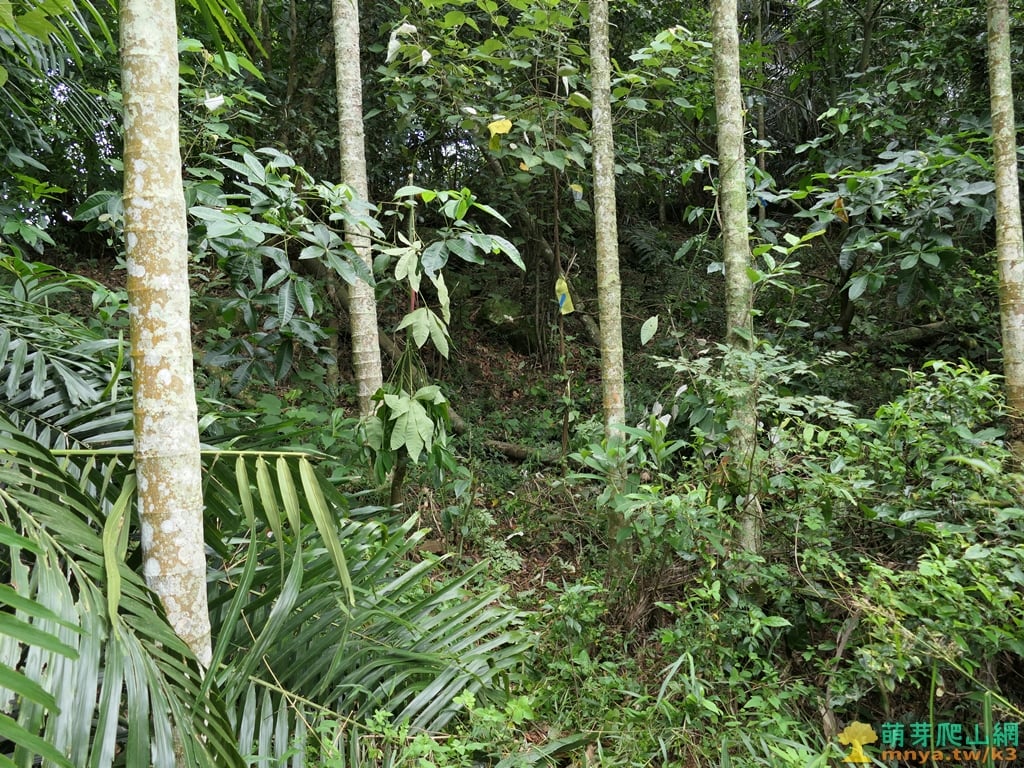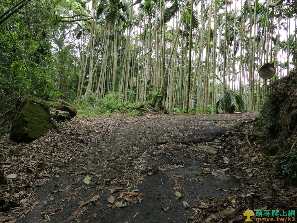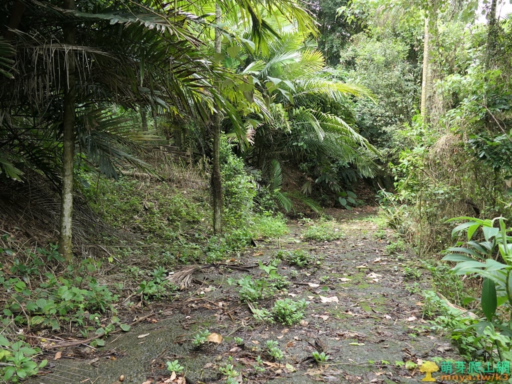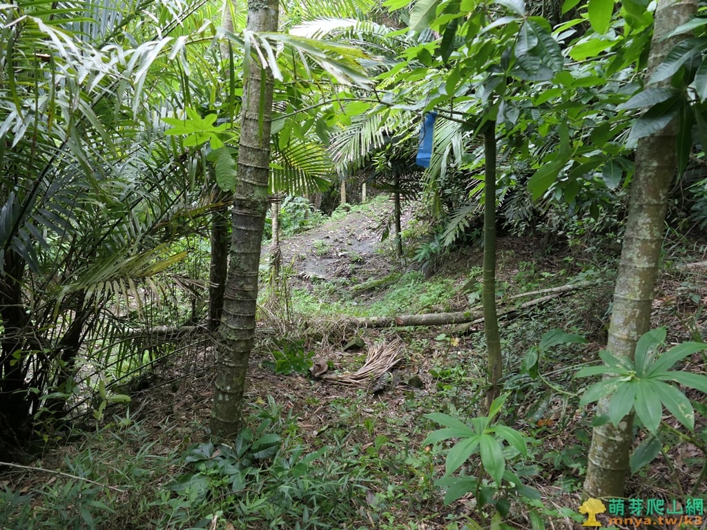 ▲行小徑十餘公尺由檳榔園進入雜木林,取直上山坡往高點走。