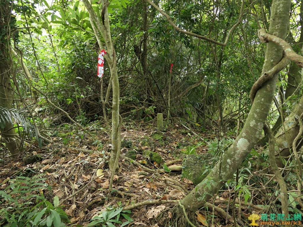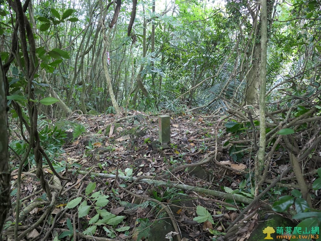 ▲14:37,繞至大石堆後方,鑽過樹藤叢後即可見到歪斜的基石,上山費時47分鐘,由上稜岔路走來約8分鐘。