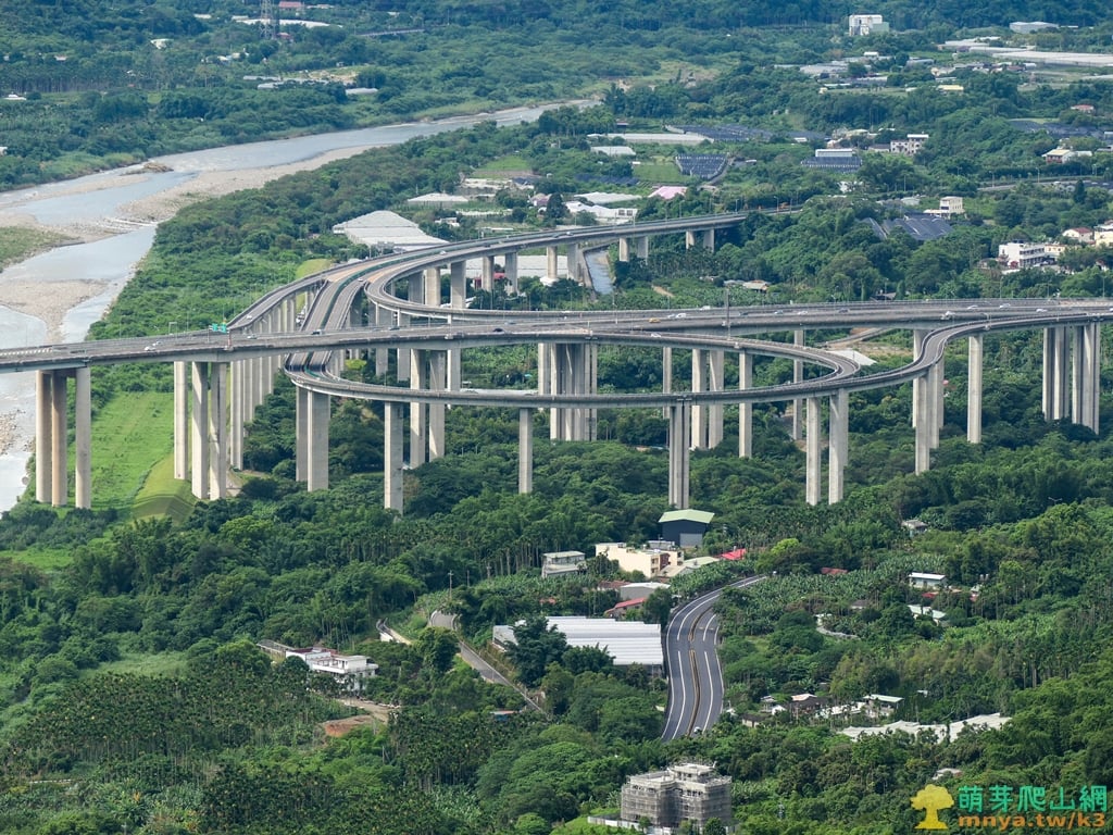 ▲往北俯瞰國道六號(水沙連高速公路)17K國姓交流道,曾選為台灣高快速公路最美八景之一,橋柱最高達68.1公尺,是臺灣第二高的橋柱。